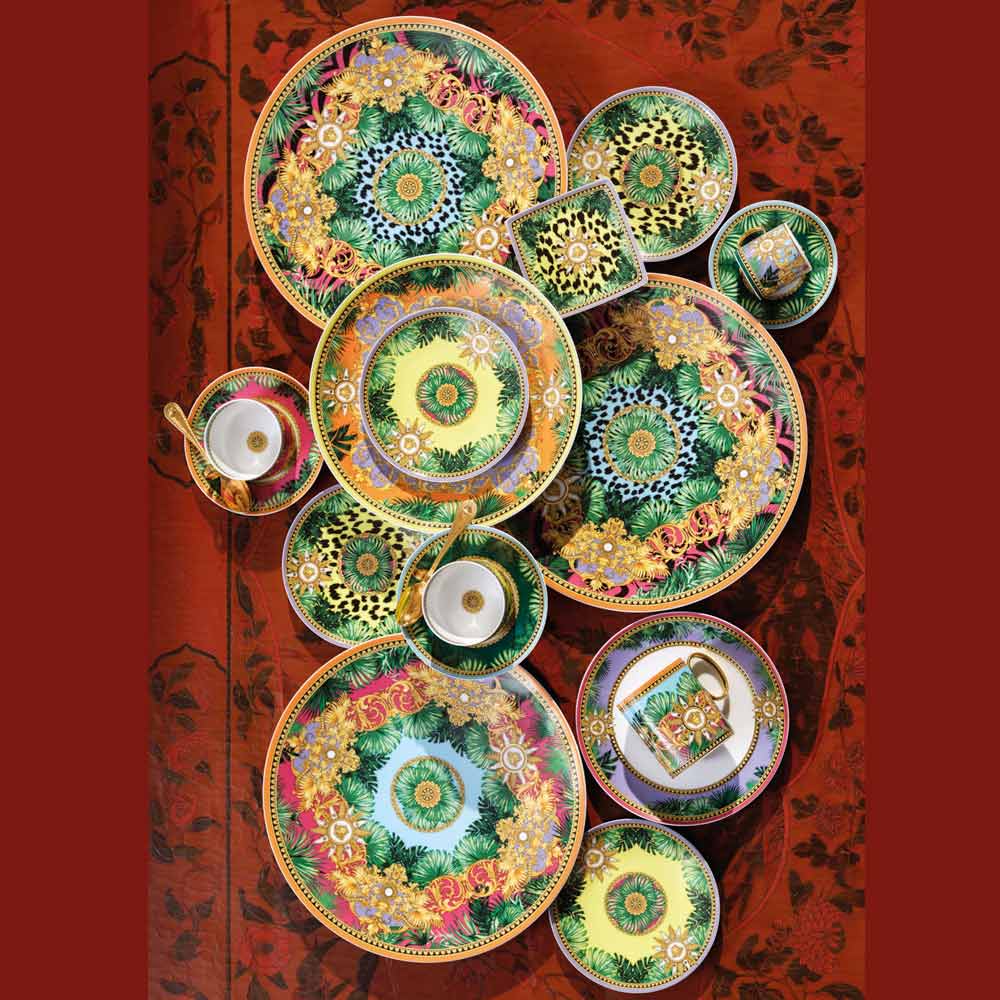 Das Tischset Jungle Animalier von Versace aus feinem Porzellan ist eine Hommage an Exotik und Luxus . Das außergewöhnliche Design vereint einen Mix aus tropischen Motiven , üppigen Blättern, goldenen Barockelementen und dem unverwechselbaren Symbol der Medusa , eingebettet in eine strahlende Sonne. Die leuchtenden Farben, die von Dunkelgrün bis Türkis reichen und durch rubinrote Details und goldene Akzente ergänzt werden, schaffen ein lebendiges und fesselndes Kunstwerk.
