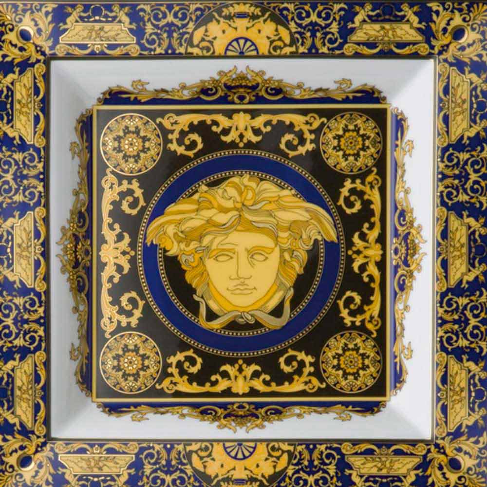 Das Highlight dieser Kollektion ist ein prächtiges goldenes Medusenhaupt, das unverwechselbare Markenzeichen von Versace, umgeben von ausdrucksstarken barocken Verzierungen. Das Medusenhaupt ist – in der Mitte – auf allen Tassen und Kannen sowie auf allen großen und kleinen Tellern der „Medusa“-Kollektion präsent. Echte Adelsfarben – leuchtendes Rot, elegantes Gold und Schwarz – und aufwendige filigrane Muster und Ornamente verleihen dem Medusenhaupt einen prächtigen Farbrahmen von beispielloser Eleganz. Die „Medusa“-Kollektion umfasst ein komplettes Tafelservice und ein Kaffeeservice sowie zahlreiche Accessoires. Große Frühstückstassen für Cappuccino und Latte, Suppenteller und Schalen gehören ebenso zur Kollektion wie wertvolle und sehr persönliche Geschenkaccessoires wie der Serviettenring, der Kerzenständer, Vasen und ein elegantes Raucherset. Die beiden Glaskollektionen „ Medusa Lumière“ und „Méandre“ sowie die Besteckkollektion „Medusa Gold“ komplettieren die elegante, farbenfrohe Tafel im einzigartigen Stil der Versace-Welt.