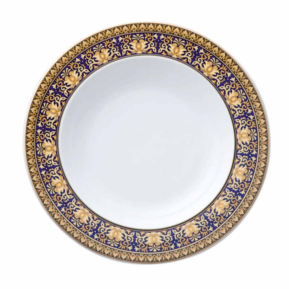 Der 22 cm große Suppenteller aus Porzellan von Versace mit einzigartigem Design ist Teil der eleganten modernen Kollektion, die, kombiniert mit einem faszinierenden und raffinierten Glamour, an vergangene Epochen erinnert und in leuchtenden Blautönen zum Ausdruck kommt und den Namen Medusa Blue trägt.