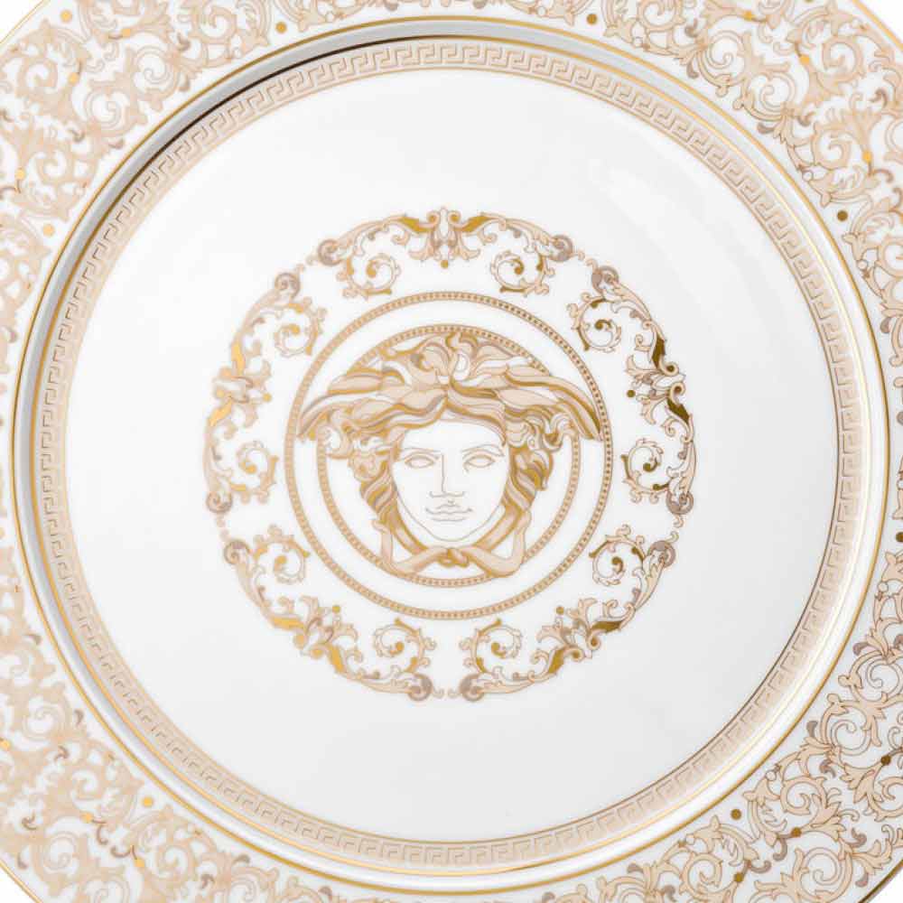 Inspiriert von der Opulenz und der einzigartigen Atmosphäre von Galadinners interpretiert Medusa Gala die traditionellen Versace-Motive in Design und Dekoration neu: Die ikonische Darstellung der Medusa wechselt mit raffinierten barocken Ornamenten in kostbarem Goldfiligran. Ein aufregender Kontrasteffekt zwischen dem Weiß des Porzellans und dem reinen Gold erweckt eine perfekte Inszenierung zum Leben, modern und zugleich einzigartig.