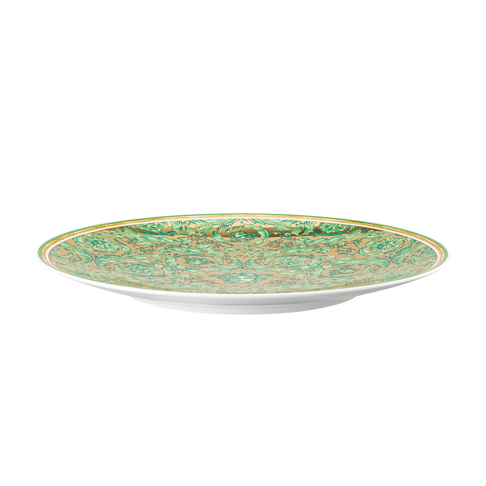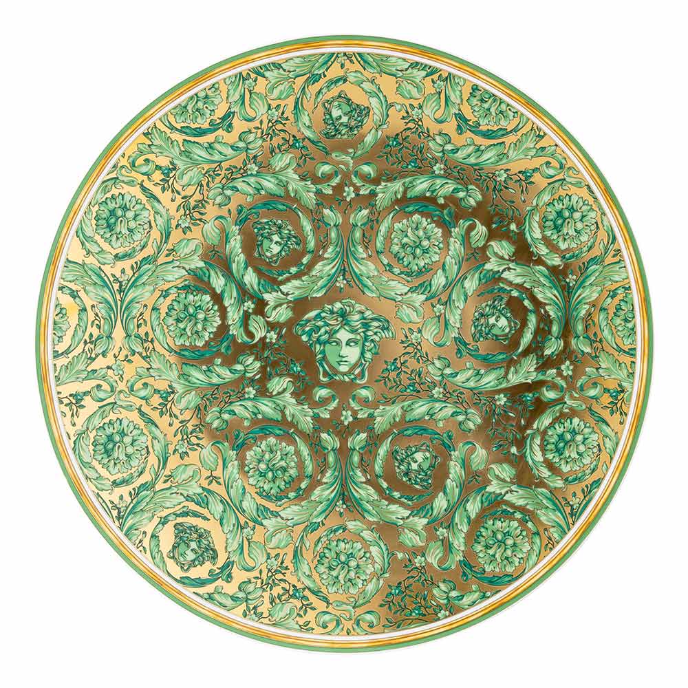 Die smaragdgrünen Töne und die eingewebten barocken Motive schaffen eine prächtige und einladende Atmosphäre und verwandeln Ihren Tisch in eine Traumkulisse. Perfekt, um Ihren Weihnachtsessen einen Hauch von Glamour und Raffinesse zu verleihen. Es ist ein Objekt, das Tradition und Moderne mit dem einzigartigen Stil von Versace verbindet.