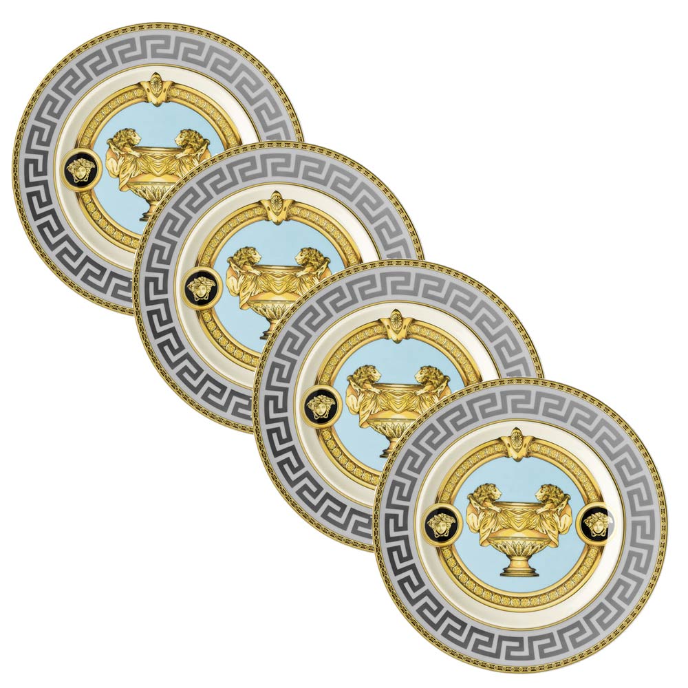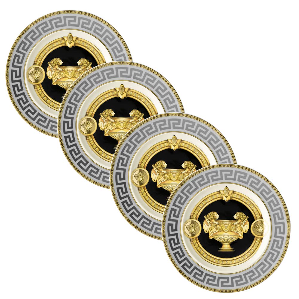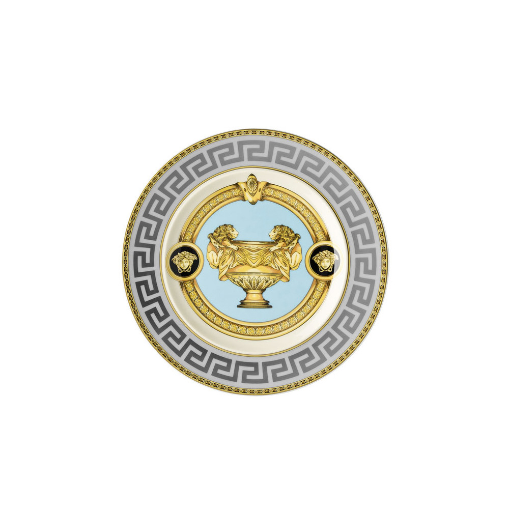 Der Versace Prestige Gala Brotteller aus feinem Porzellan ist ein perfektes Beispiel für Luxus und zeitlose Eleganz . Das anspruchsvolle Design zeichnet sich durch eine zentrale Verzierung mit einer goldenen Amphore aus, einem Symbol für Königlichkeit und Tradition, umrahmt von einem kräftigen griechischen Motiv und goldenen Details, die die Essenz des Hauses einfangen. Erhältlich auf schwarzem oder hellblauem Hintergrund bietet er eine Stilauswahl für jeden Anlass.