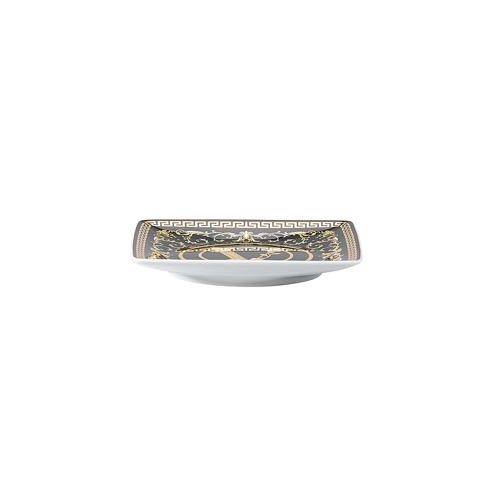 Die flachen, quadratischen Tassen Virtus Gala von Versace sind die perfekte Kombination aus anspruchsvollem Design und Funktionalität. Sie sind aus feinem Porzellan gefertigt und zeichnen sich durch ihren eleganten , glänzenden Hintergrund aus, der mit goldenen Details im Barockstil verziert ist, darunter das ikonische Versace-Symbol „V“, ein Sinnbild für zeitlosen Stil und Luxus .