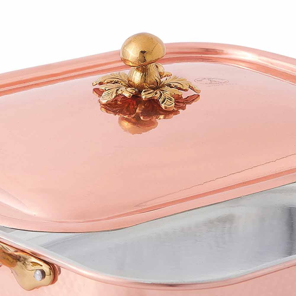 Rechteckiger Bräter mit Kupferdeckel und Messinggriffen, edles Design made in Italy.