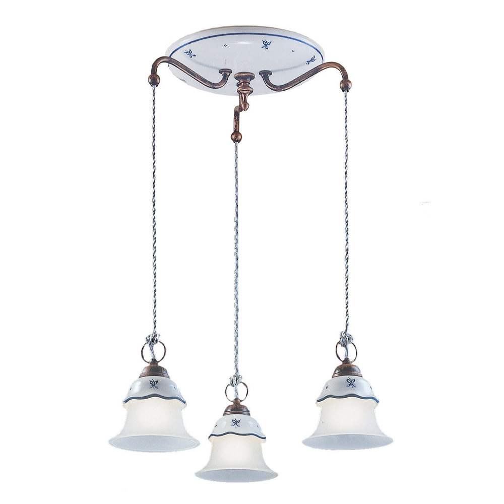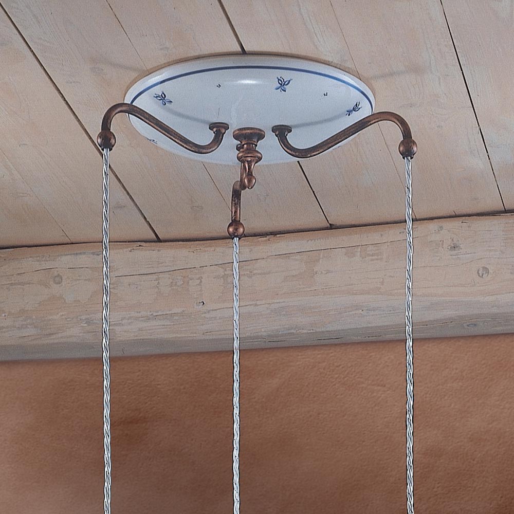 Die 3-flammige Pendelleuchte mit runder Basis besteht vollständig aus Eisen und gedrehten Schnüren mit Keramikmuscheln mit handbemalten Dekorationen und geätzten Glasglocken , die die Handwerkskunst und Geschicklichkeit der Handwerker unterstreichen.