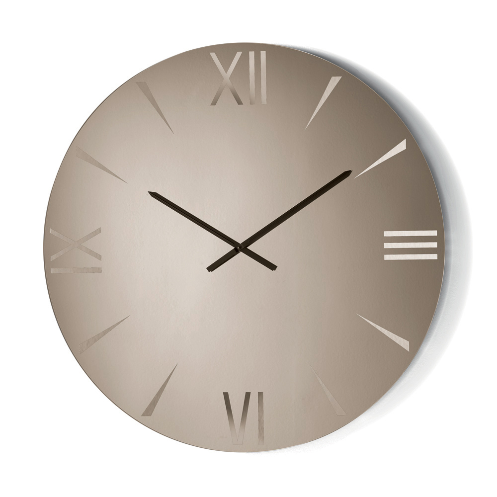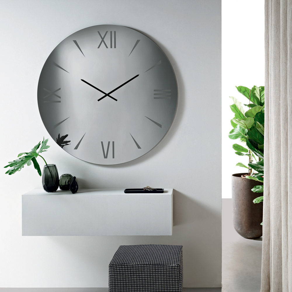 Die aus Spiegelglas gefertigte Uhr besticht durch ihre lasergravierten Ziffern , die mit grafischer Präzision und visueller Zurückhaltung gestaltet sind. Die reflektierende Oberfläche fängt das Licht ein und vergrößert den Raum, wodurch ein raffiniertes Zusammenspiel von Tiefe und Spiegelungen entsteht.