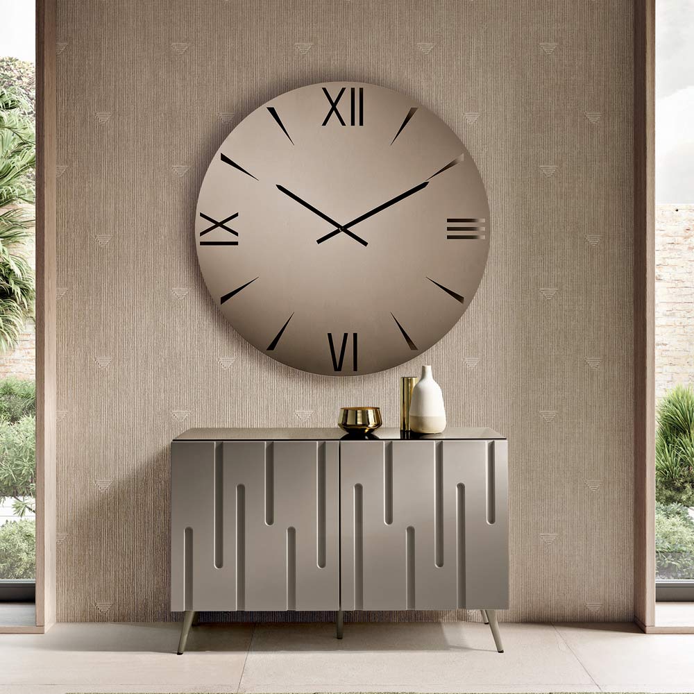 Eine elegante , in Italien gefertigte Designer-Wanduhr , ideal zur Verschönerung von Wohnzimmer , Eingangsbereich oder Esszimmer . Ihr modernes Design verwandelt die Zeitanzeige in ein dekoratives Element, das der Wand Eleganz und Persönlichkeit verleiht.