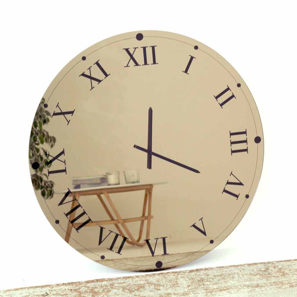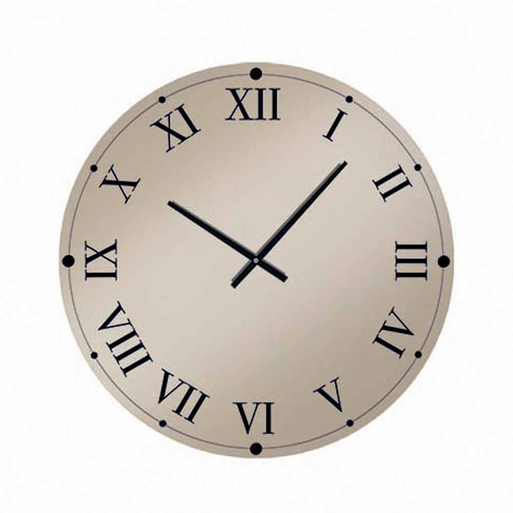 Runde Wanduhr, hergestellt in Italien, aus verspiegeltem Kristallglas mit römischen Ziffern und schwarzen Zeigern.