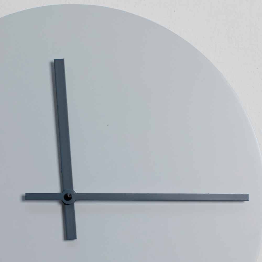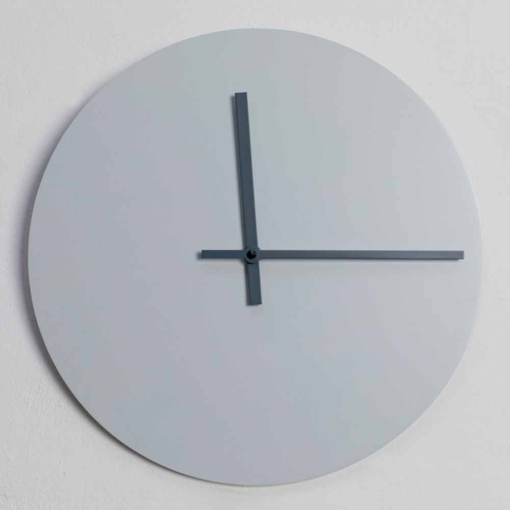 Wanduhr aus pudergrau und walblau lackiertem Holz, modernes rundes Design made in Italy.