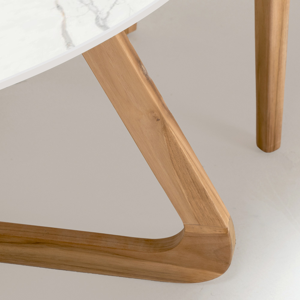 Tisch für den Außenbereich mit einer Basis aus massivem natürlichem Teakholz (35 mm dick), einer Platte aus Infinity-Steinzeugkeramik (12 mm dick) mit mattem Calacatta Oro- Finish und einem Untergestell aus Okumé-Bootssperrholz , vollständig in Italien hergestellt.
