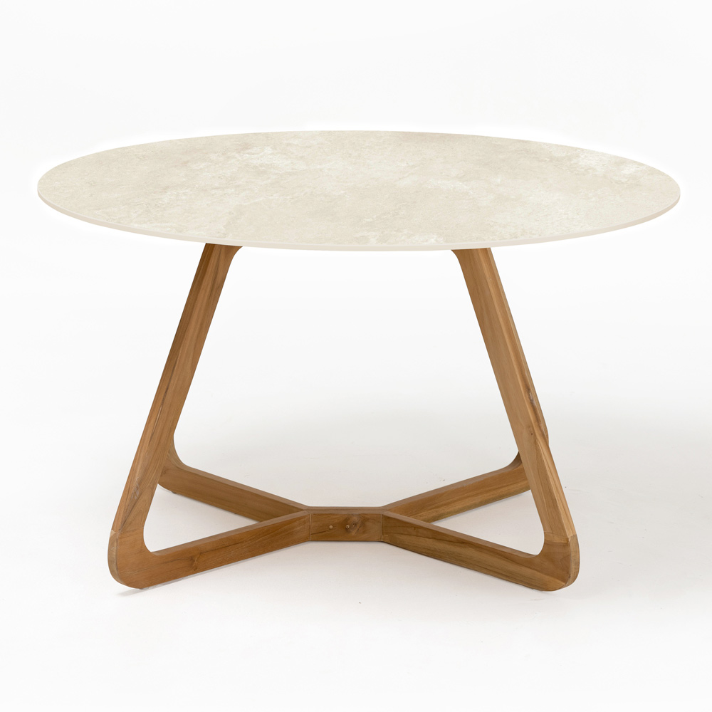 Tisch für den Außenbereich mit einer Basis aus massivem natürlichem Teakholz (35 mm dick), einer Infinity-Platte aus Steinzeugkeramik (12 mm dick) mit mattem Chianca di Ostuni -Finish und einem Untergestell aus Okumé-Bootssperrholz , vollständig in Italien hergestellt.