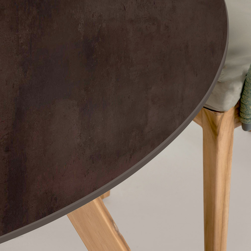 Gartentisch mit einer Basis aus massivem natürlichem Teakholz (35 mm dick), einer Infinity-Steinzeugkeramikplatte (12 mm dick) mit mattem Metal-Corten- Finish und einem Untergestell aus Okumé-Bootssperrholz , vollständig in Italien hergestellt.