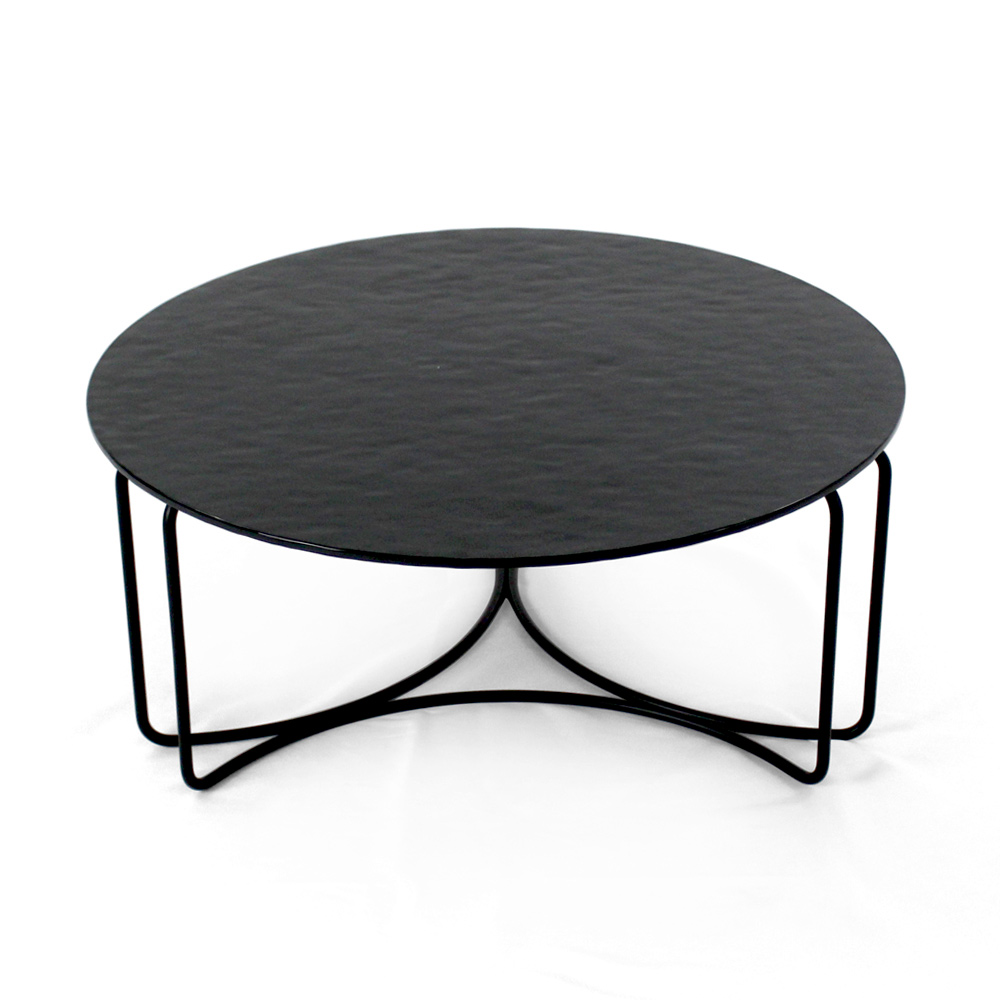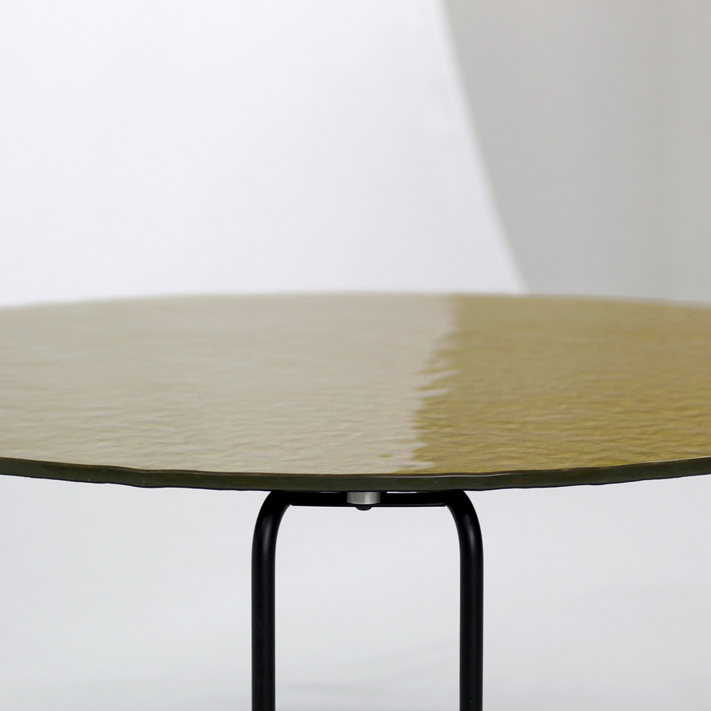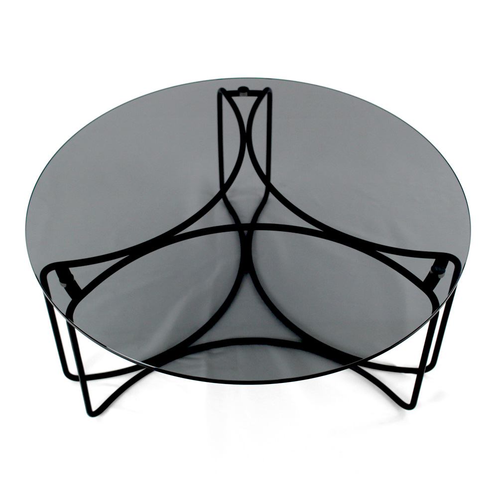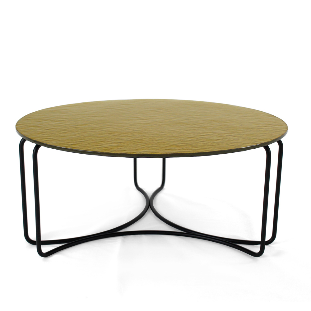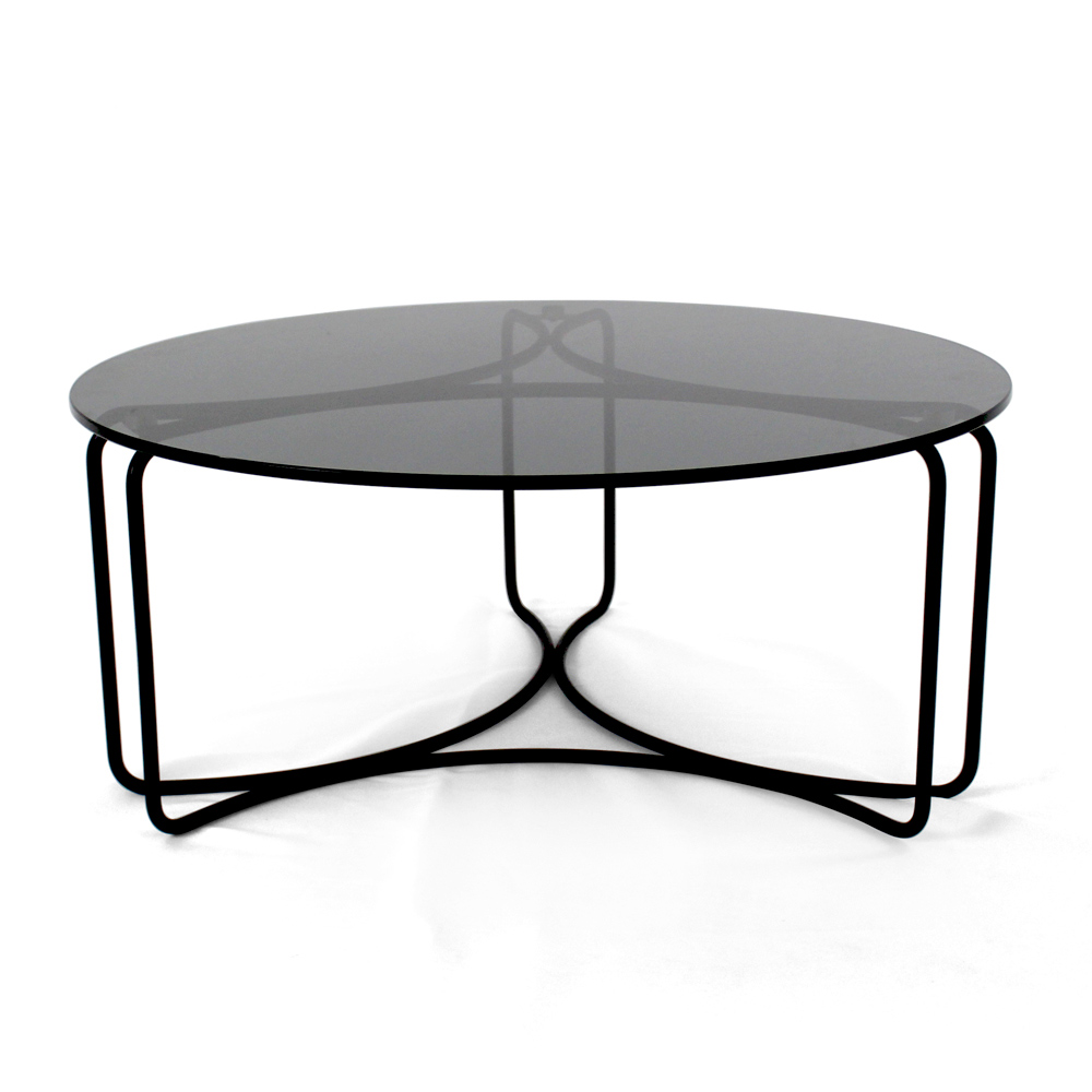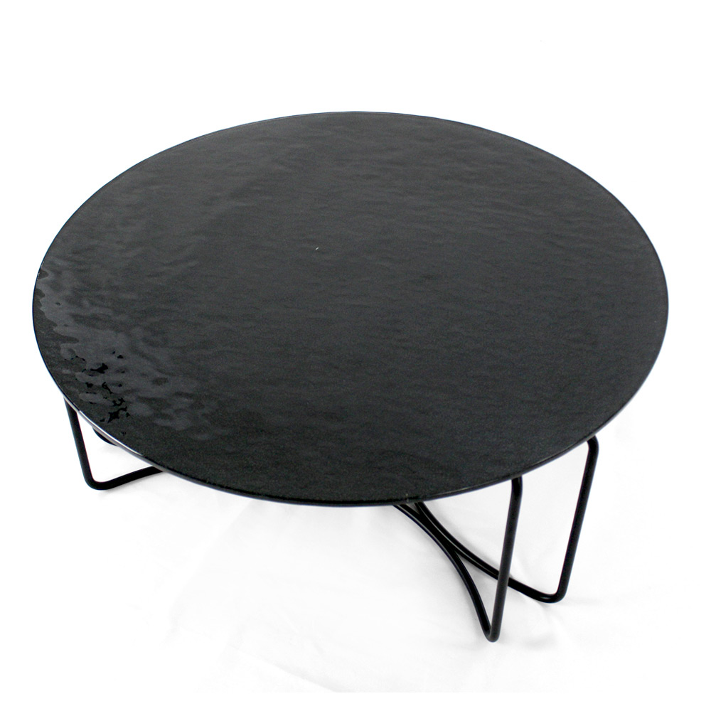 Runder Couchtisch mit lackiertem Stahlsockel und Glasplatte.