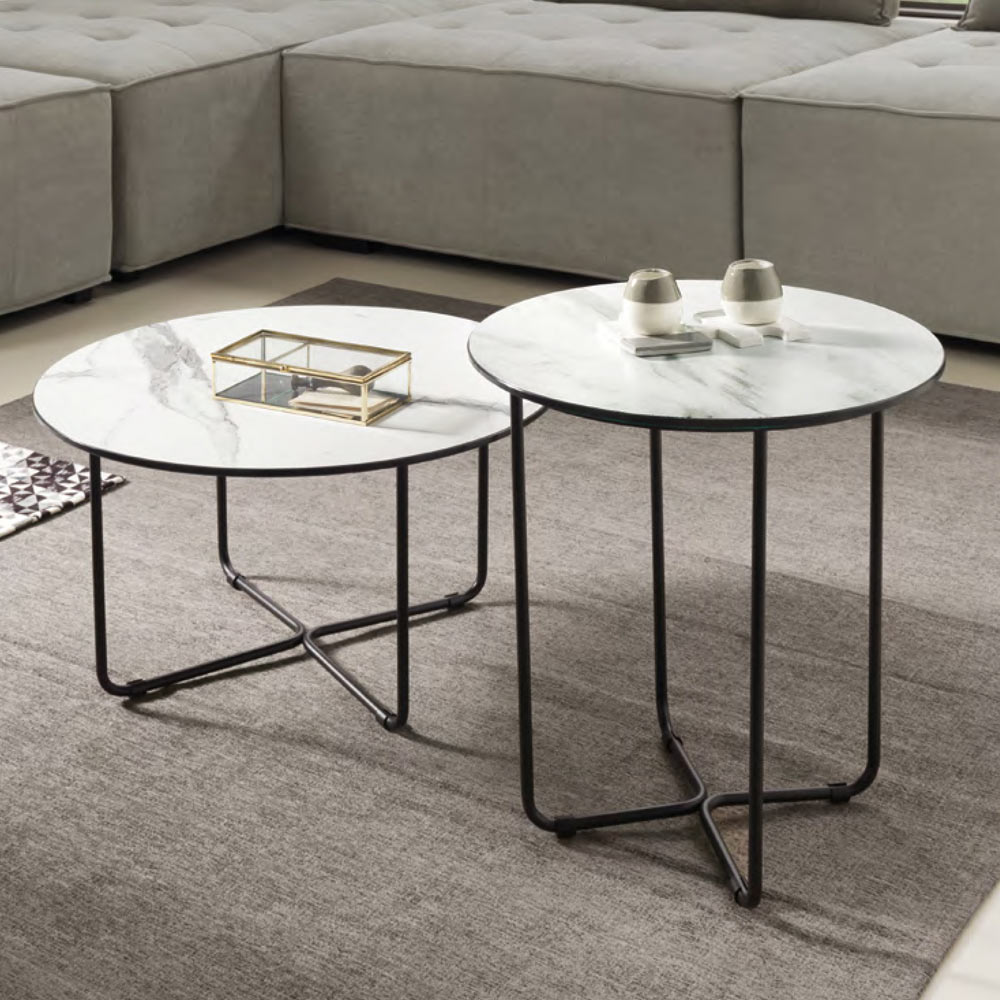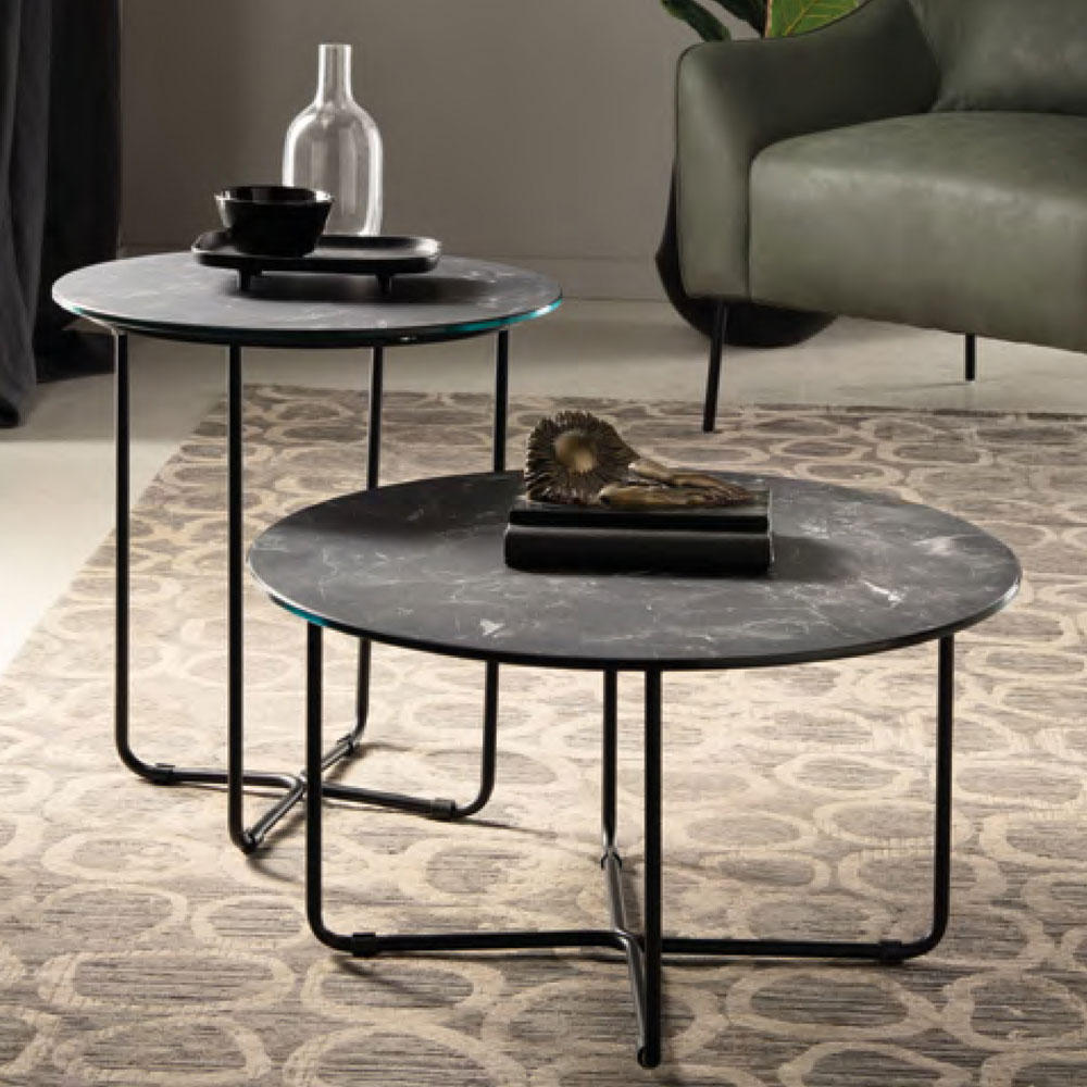 Couchtisch mit runder Glasplatte mit Marmoreffekt Made in Italy.