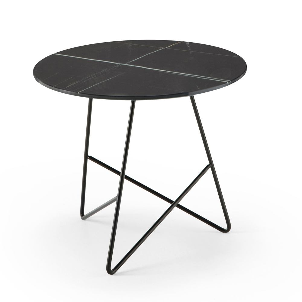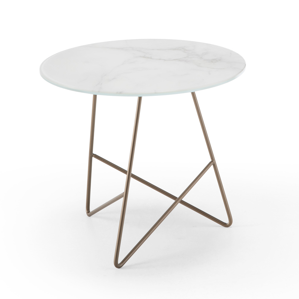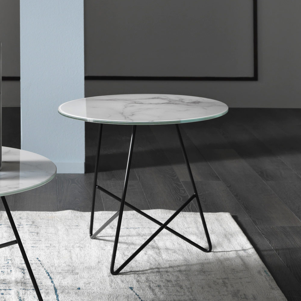 Der Couchtisch besteht aus einer Metallbasis in verschiedenen RAL-Farben und einer Basis aus weißem oder schwarzem Glasmarmor und ist somit äußerst raffiniert und luxuriös.