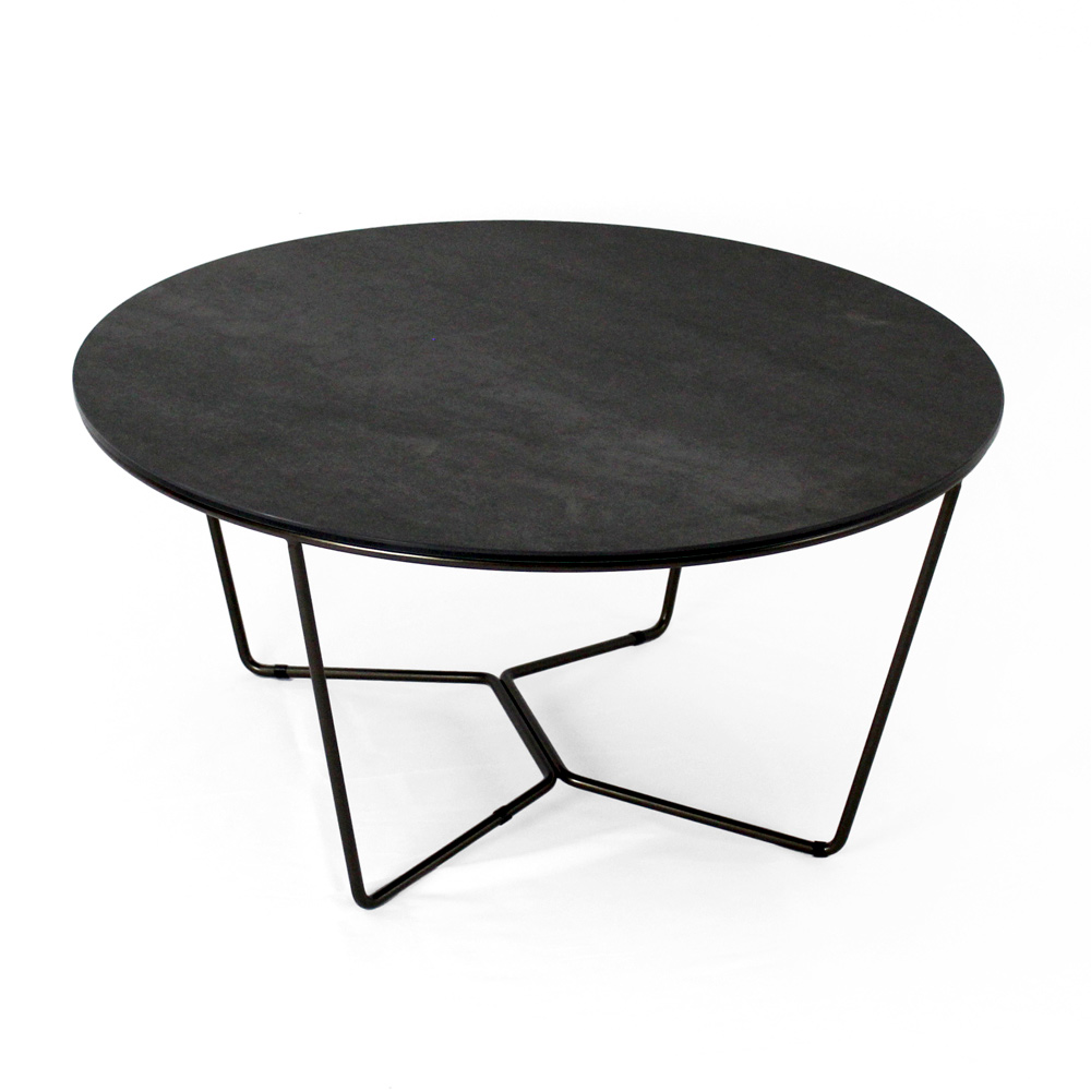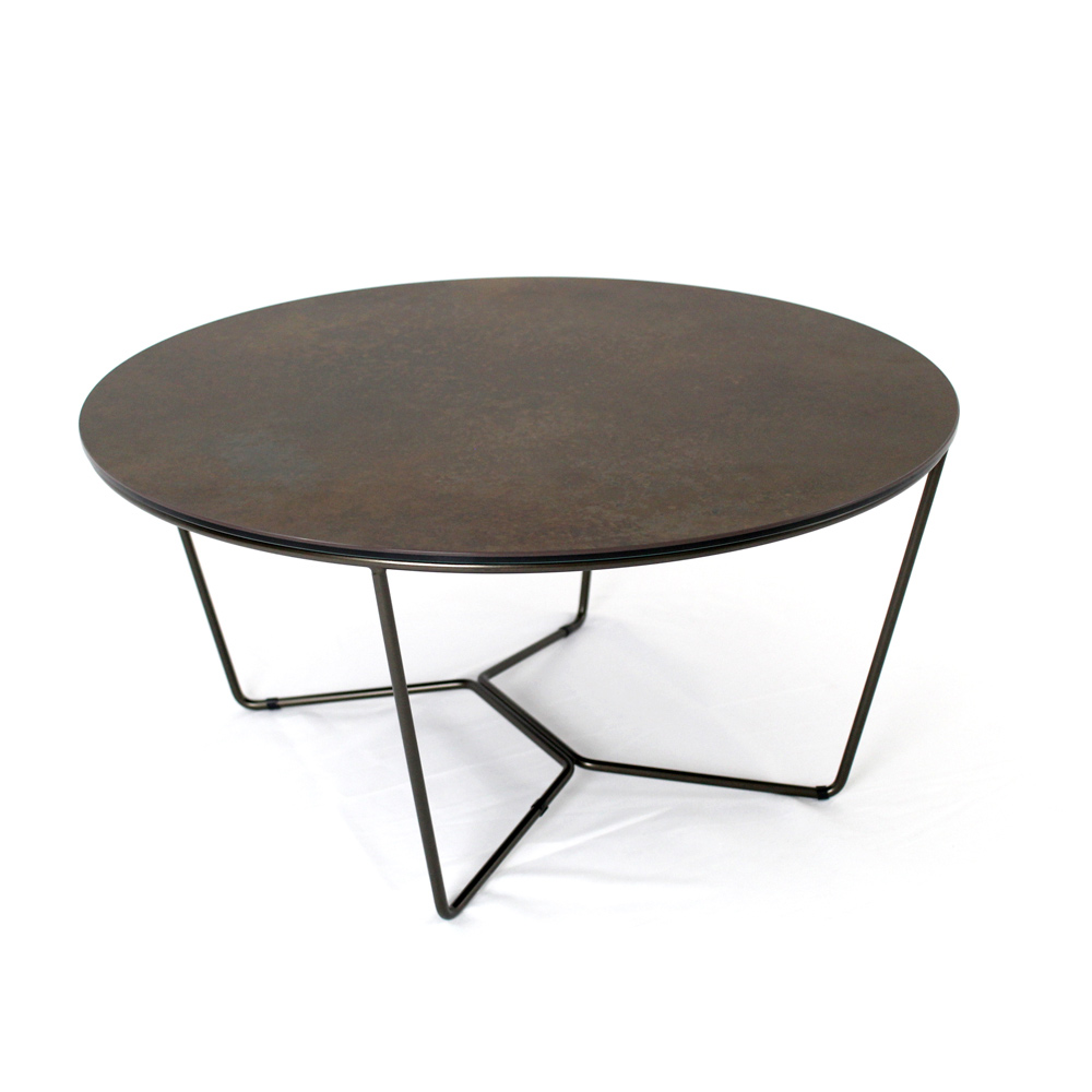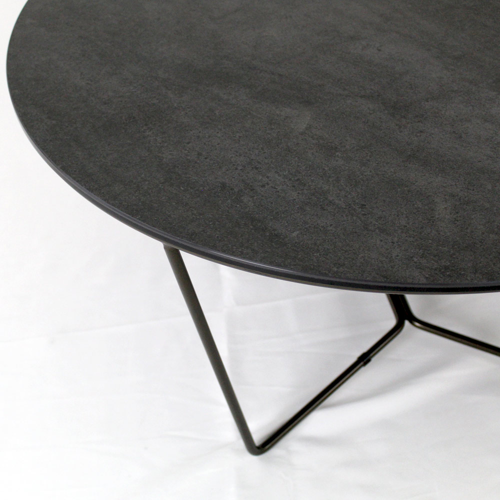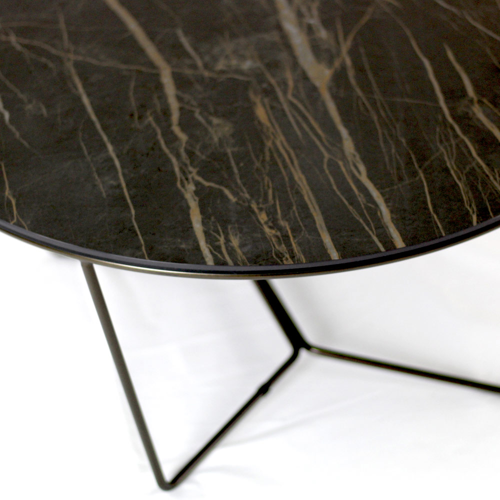 Runder Couchtisch mit lackiertem Stahlsockel und Platte aus Feinsteinzeug.