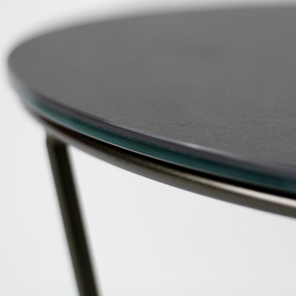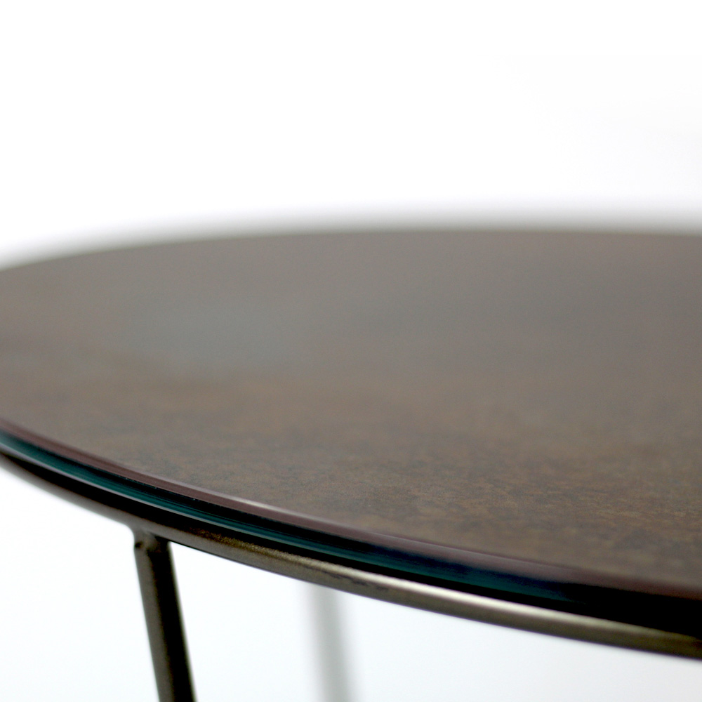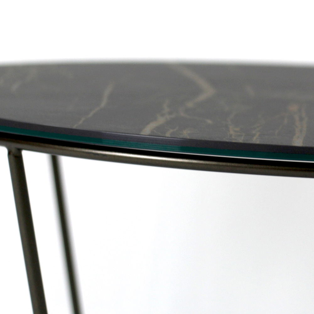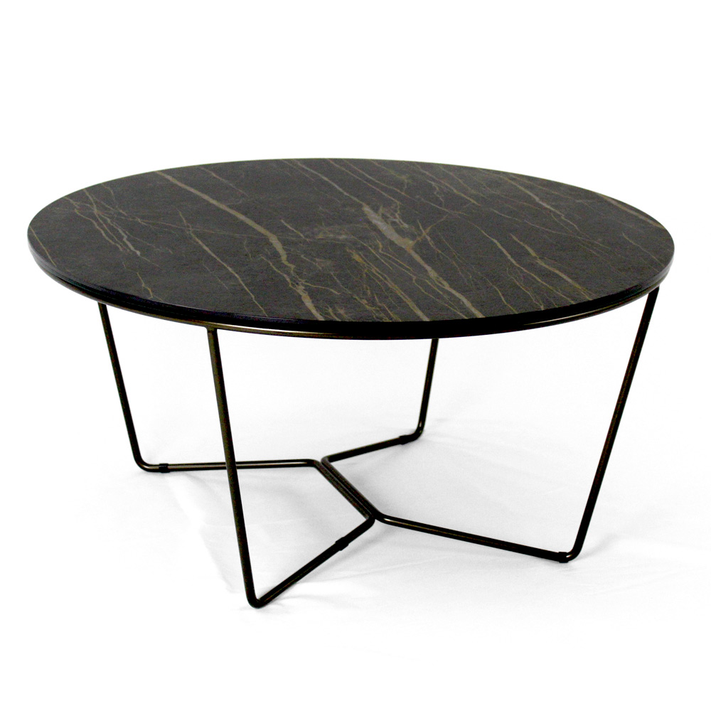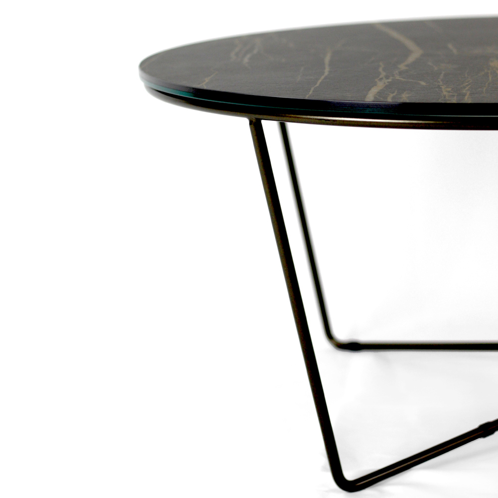 Runder Couchtisch mit lackiertem Stahlsockel und Platte aus Feinsteinzeug.