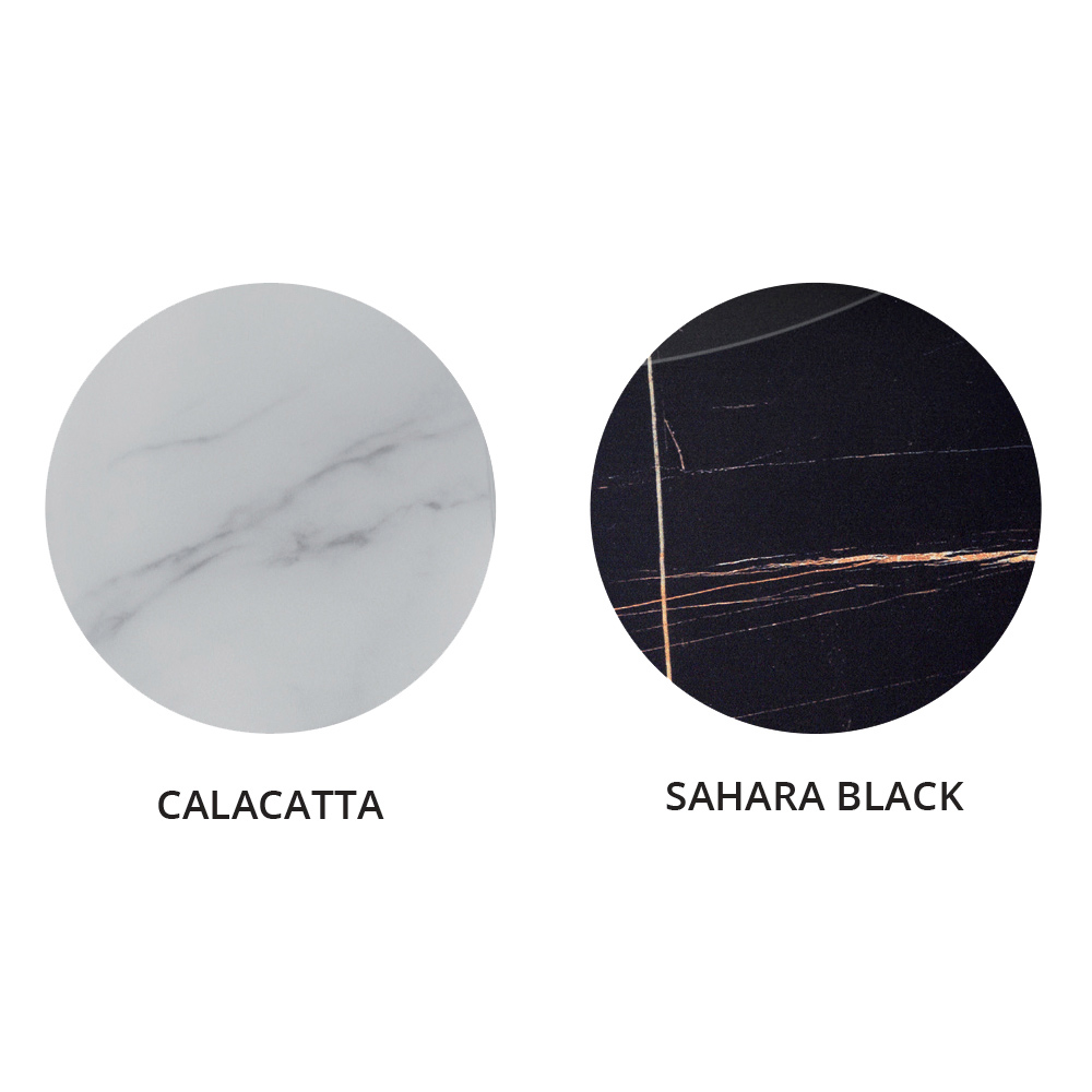 Der Couchtisch besteht aus einer Metallbasis in verschiedenen RAL-Farben und einer Basis aus weißem oder schwarzem Glasmarmor und ist somit äußerst raffiniert und luxuriös.