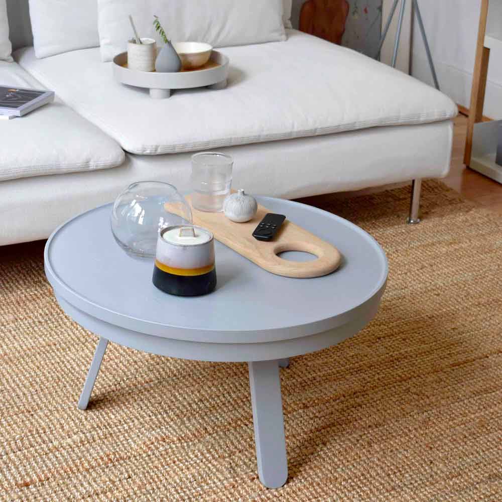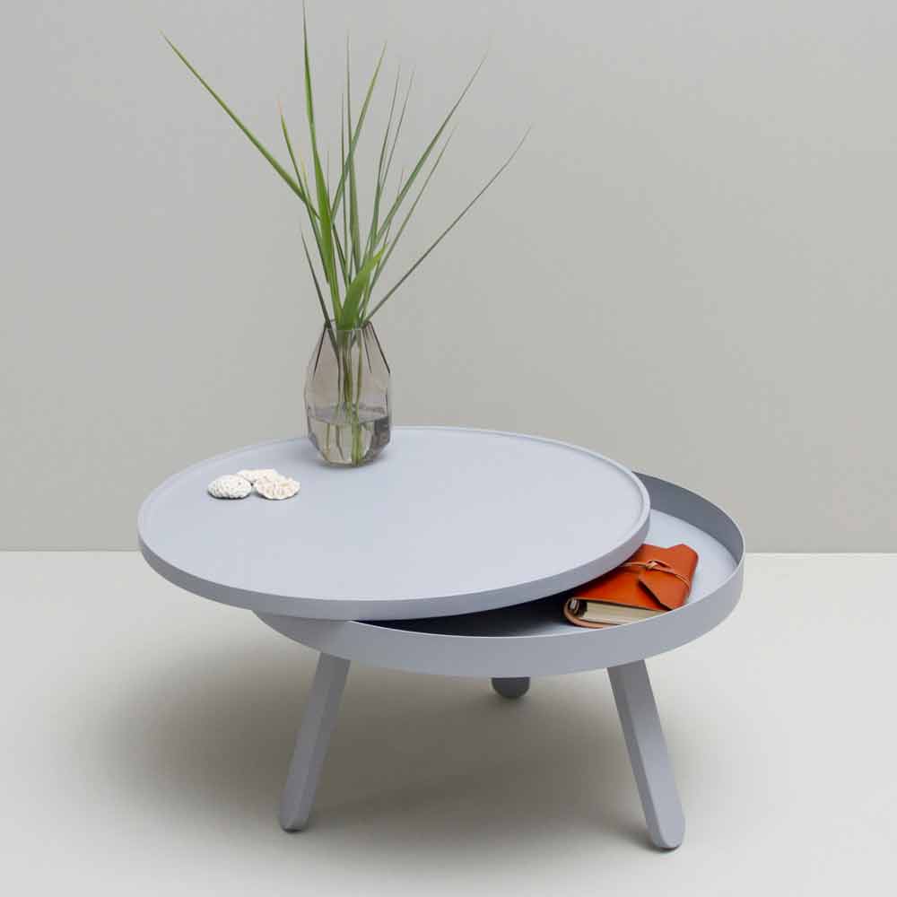 Runder Couchtisch aus Massivholz und Stahl mit Ablagefach.