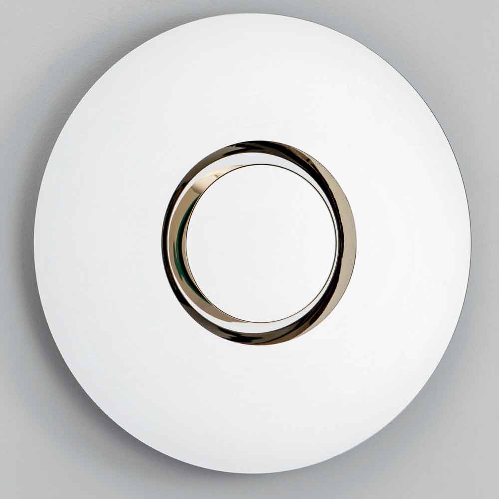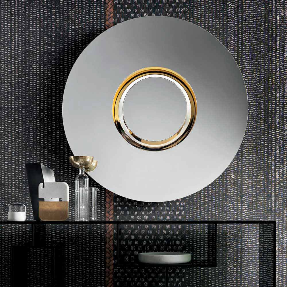 Der Wandspiegel hat ein rundes Design und zeichnet sich durch den abnehmbaren Mittelteil aus , der ihn originell und einzigartig macht: Tatsächlich ist er ein rundes und konzentrisches Möbelstück mit einem Mittelkreis aus goldenem Metall, das auch als Mittelstück verwendet werden kann.