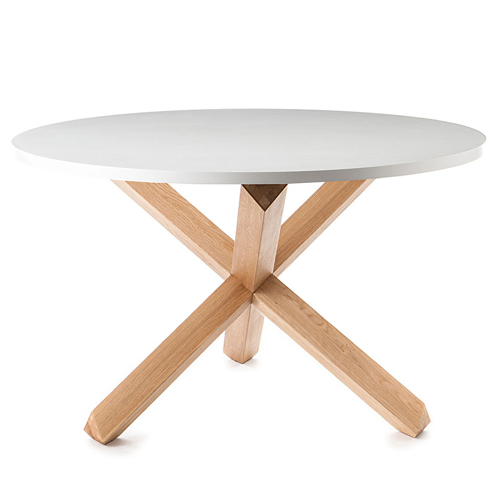 Runder Esstisch aus MDF und Massivholz.
