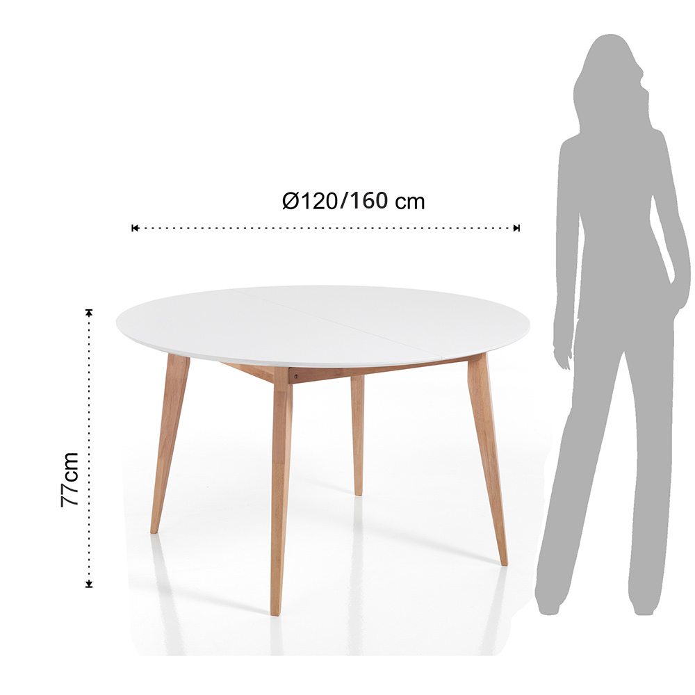 Esstisch mit runder ausziehbarer Platte aus mattweiß lackiertem MDF (Stärke 3 cm) und Beinen aus Massivholz mit gebleichter Eiche . Ein Produkt mit einem einfachen und klaren Design, ideal für diejenigen, die einen essentiellen und vielseitigen Möbelstil lieben, der den Stil ihres Esszimmers oder ihrer Küche mit Geschmack und Persönlichkeit ergänzt. Seine Stärke stellt das ausziehbare Oberteil dar, das dank einer Verlängerung von jeweils 40 cm eine Länge von 160 cm erreicht.