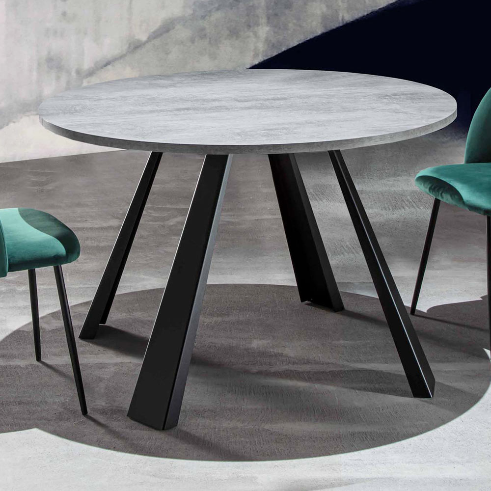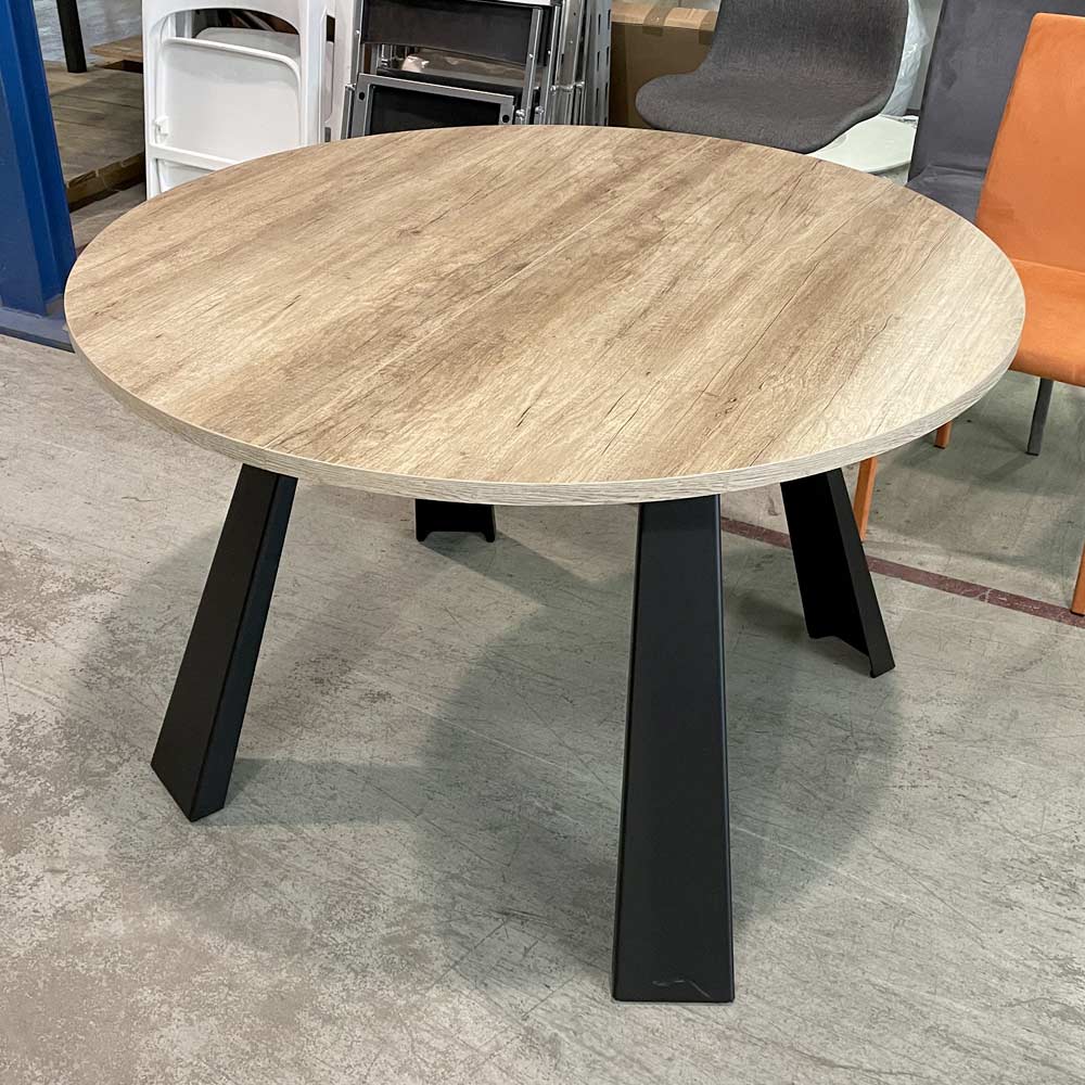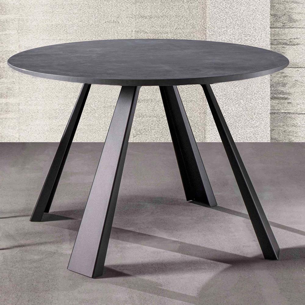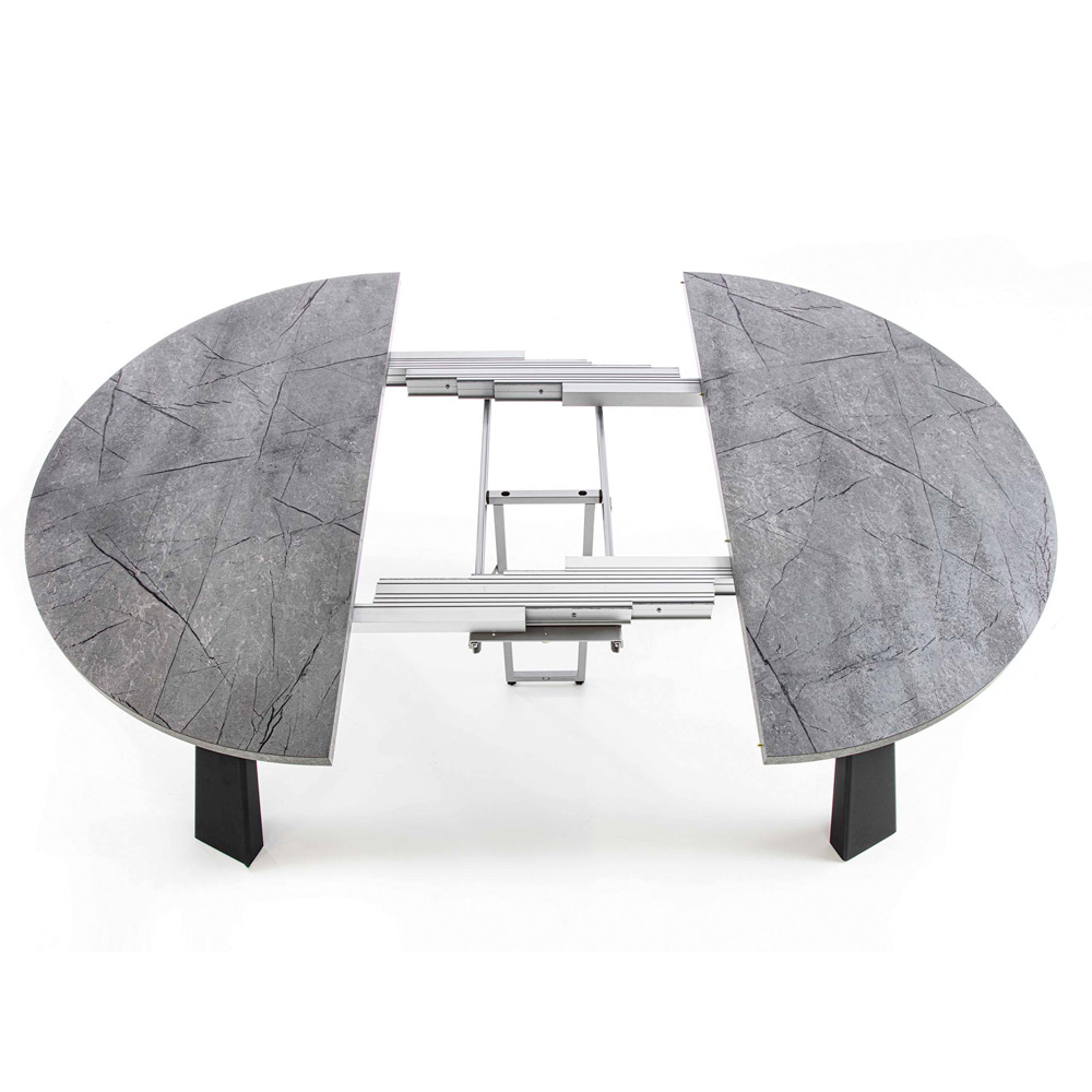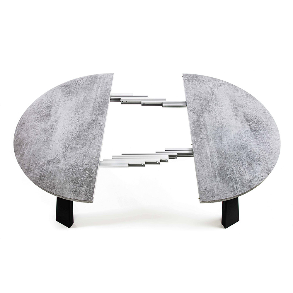 Runder Esstisch ausziehbar bis 370 cm aus Melaminholz und Metall.