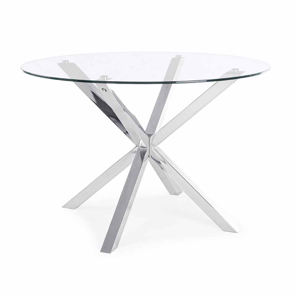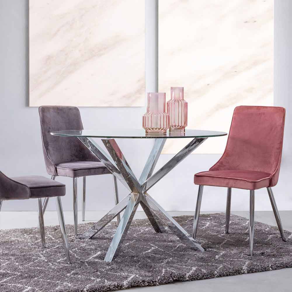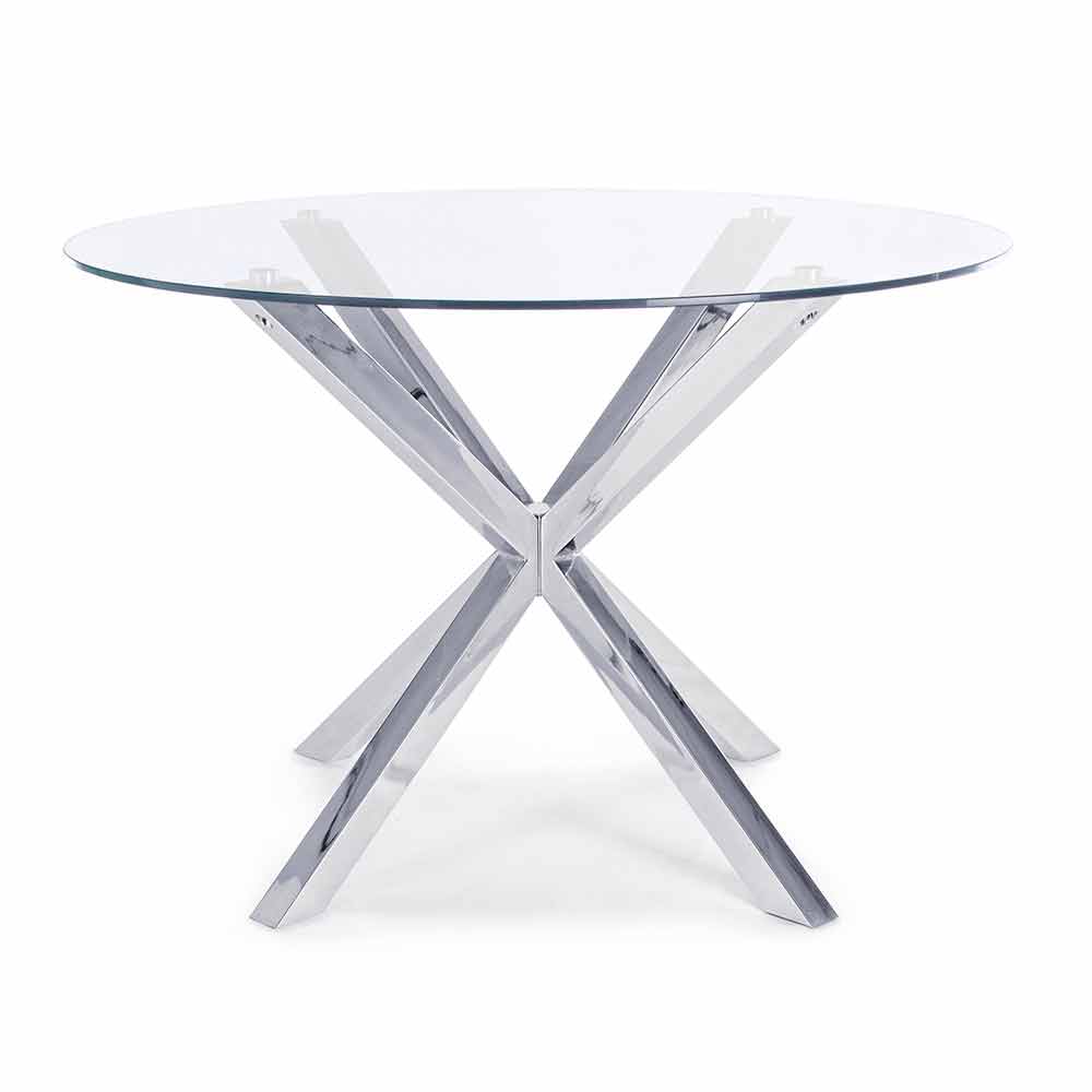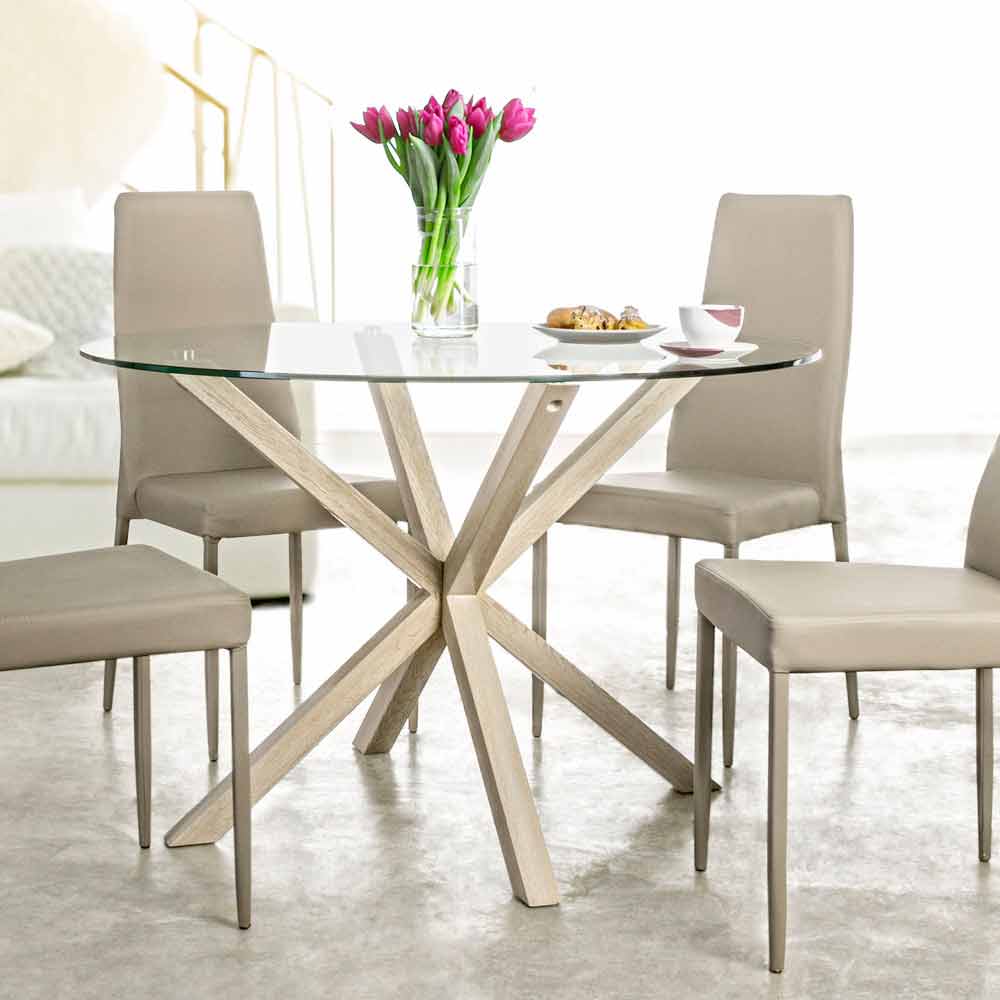 Moderner Esstisch mit runder Platte aus gehärtetem Glas.