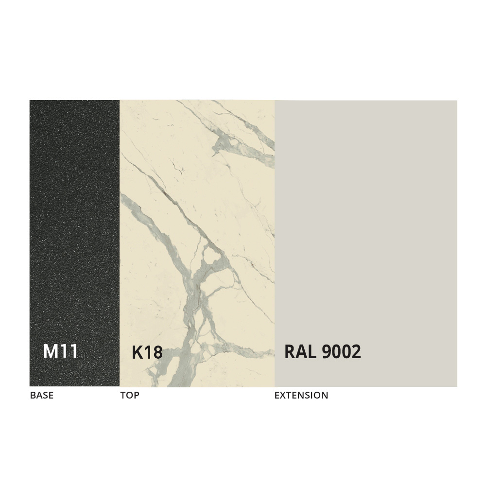 Keramikplatte , die in zwei Halbebenen unterteilt ist, um die zentrale interne Erweiterung mit Buchöffnung aufzunehmen, wodurch die Oberfläche und die Möglichkeiten für Geselligkeit vergrößert werden.