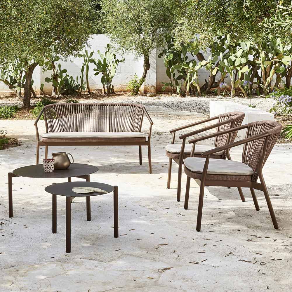Garten-Couchtisch bestehend aus Platte und Struktur aus pulverbeschichtetem Aluminium in Metallbronzefarbe. Dank seines geradlinigen, sauberen und einfachen Designs eignet sich dieser Couchtisch perfekt zur Dekoration von Außenbereichen wie Terrassen, Schwimmbädern und Gärten, findet aber auch in den verschiedenen Wohnbereichen im Innenbereich seinen Platz.