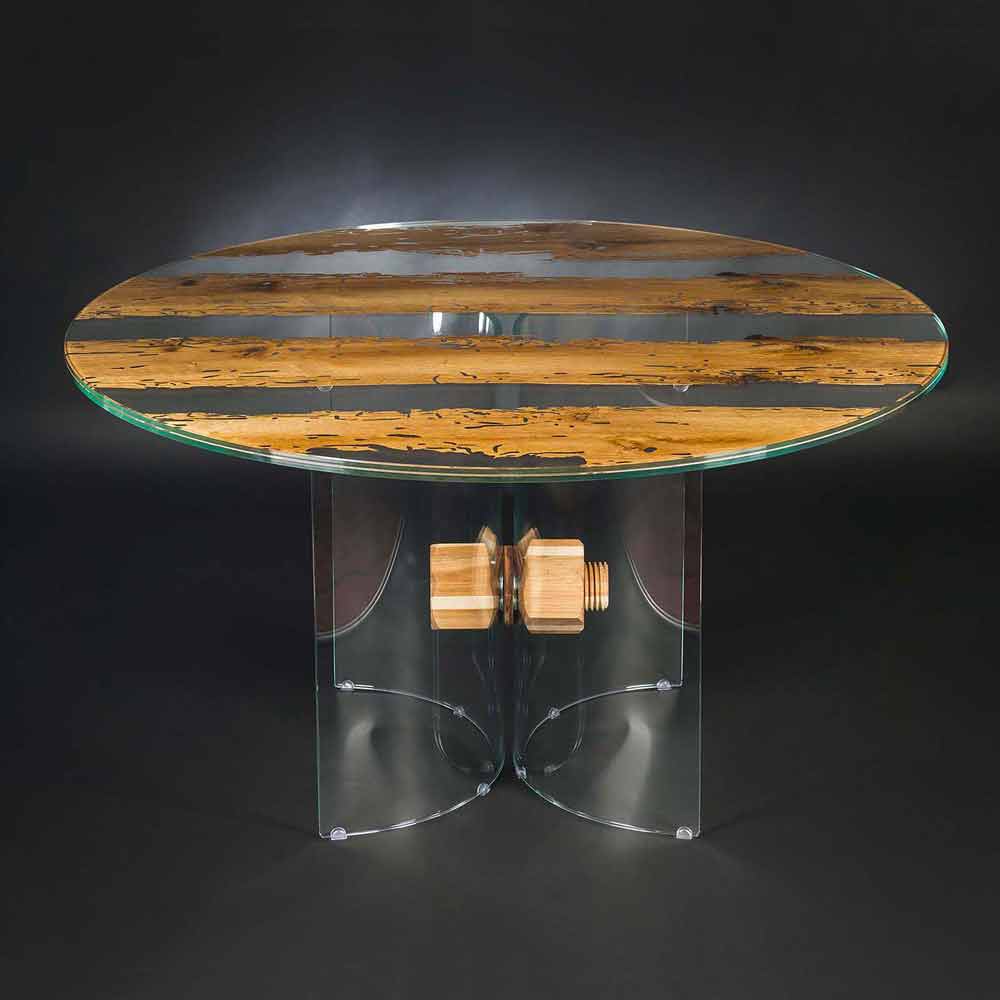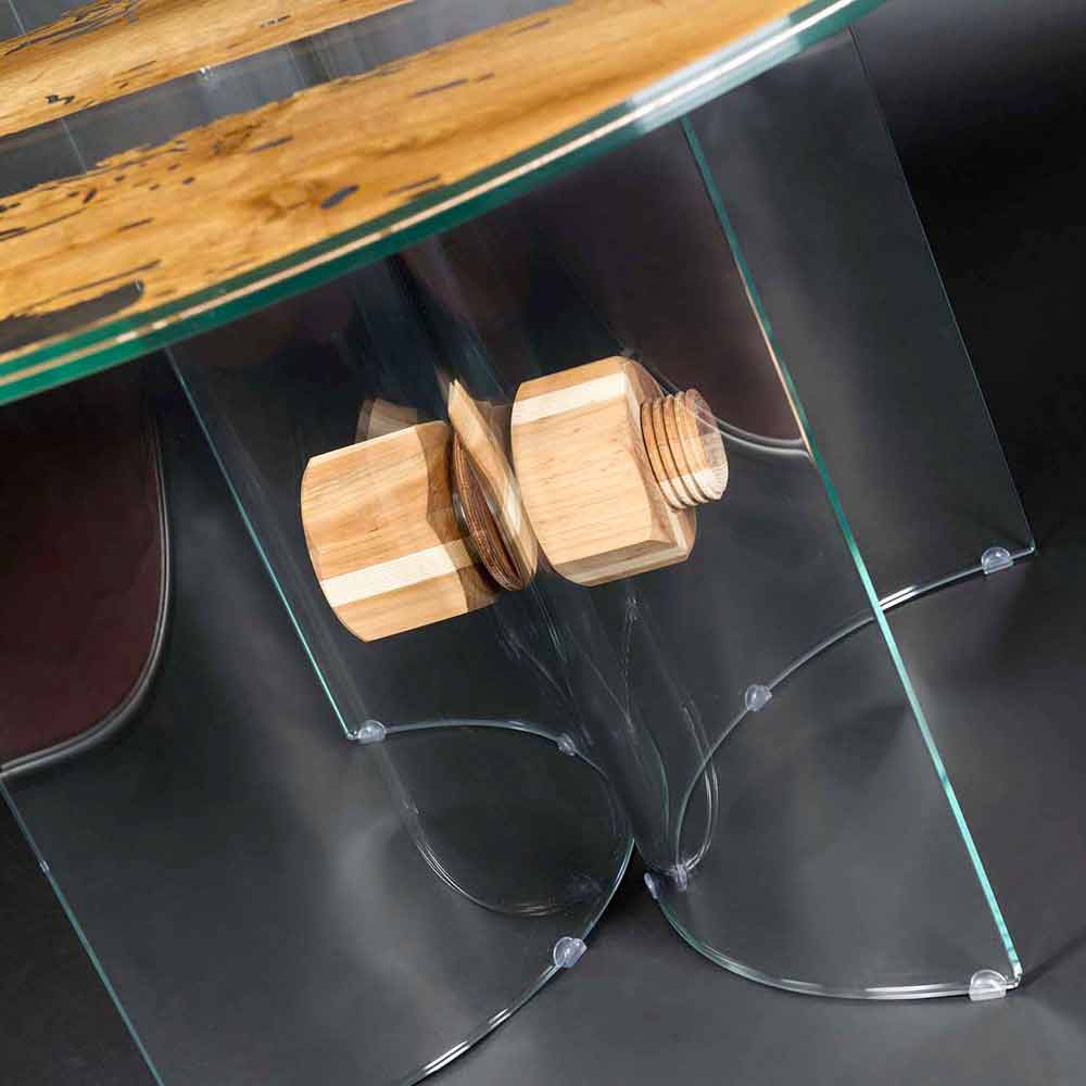 Der Tisch Venezia besteht aus zwei Glasschichten 10+10 mm. Dazwischen liegt ein Blatt aus veraltetem Briccola Holz.
