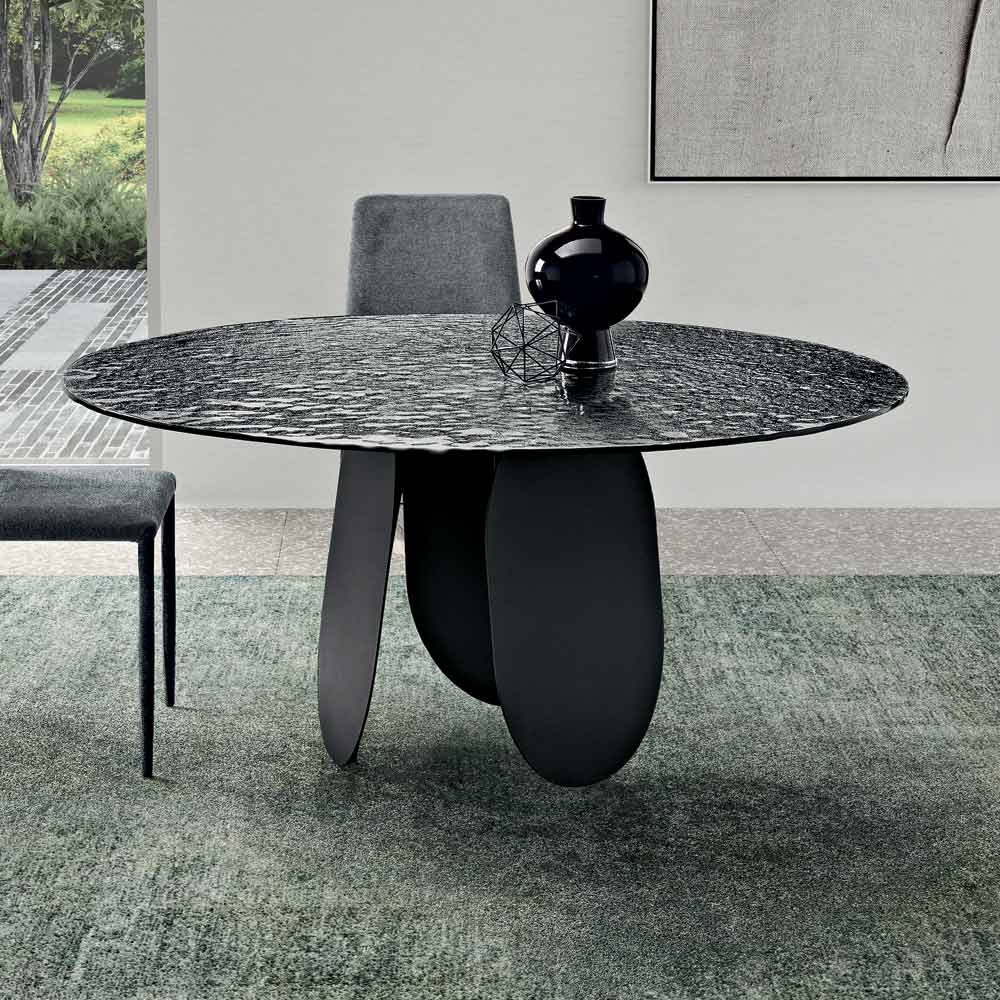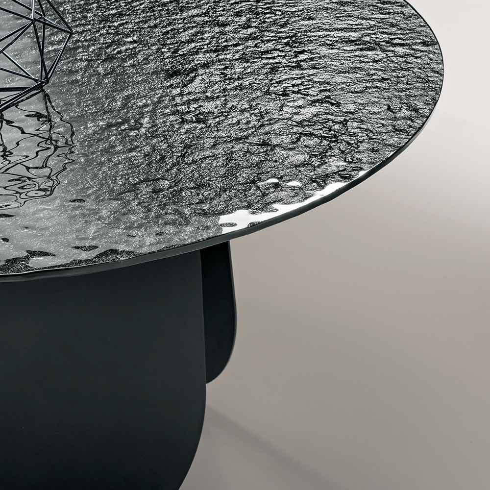Ein eleganter runder Tisch, Made in Italy , der Ess- oder Wohnzimmer mit seiner modernen und ausdrucksstarken Ästhetik bereichert. Die rückseitig silberfarbene, gehämmert Glasplatte reflektiert das Licht mit irisierenden Effekten und verleiht dem Raum Helligkeit und Charakter.