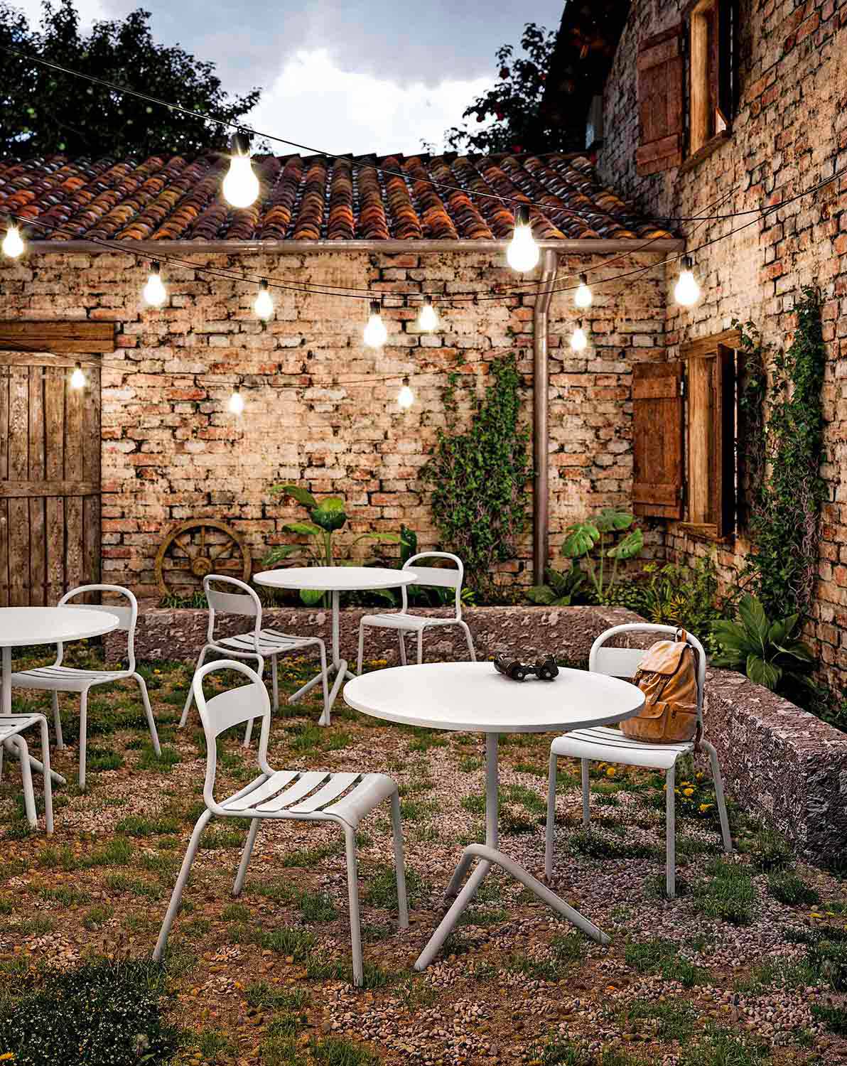 Runder Tisch im Freien aus Metall und stapelbarem und faltbarem Blech Made in Italy.