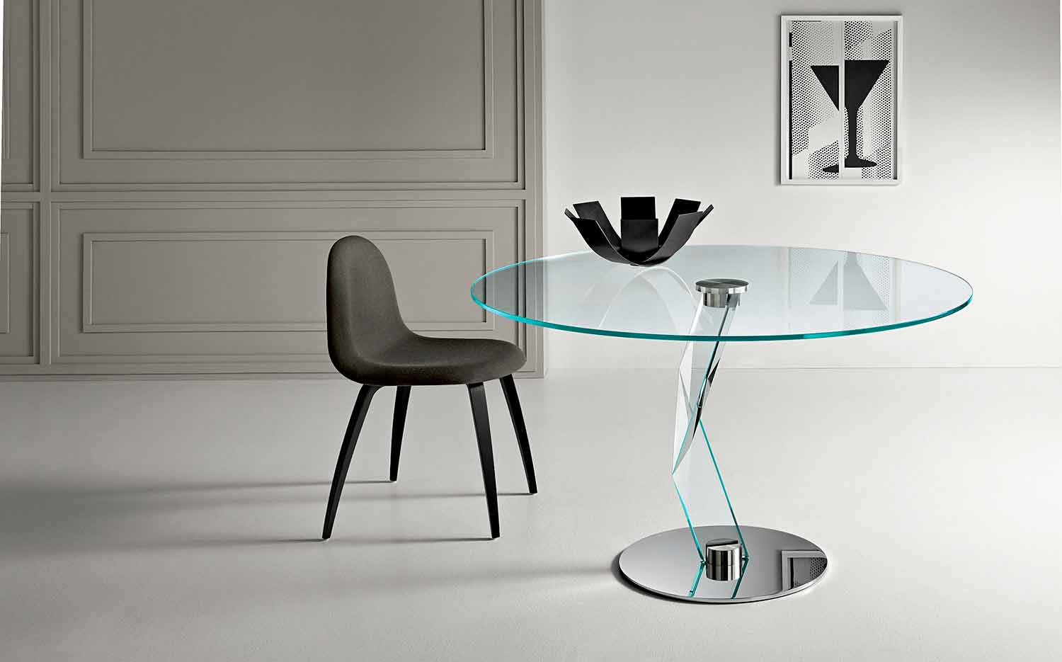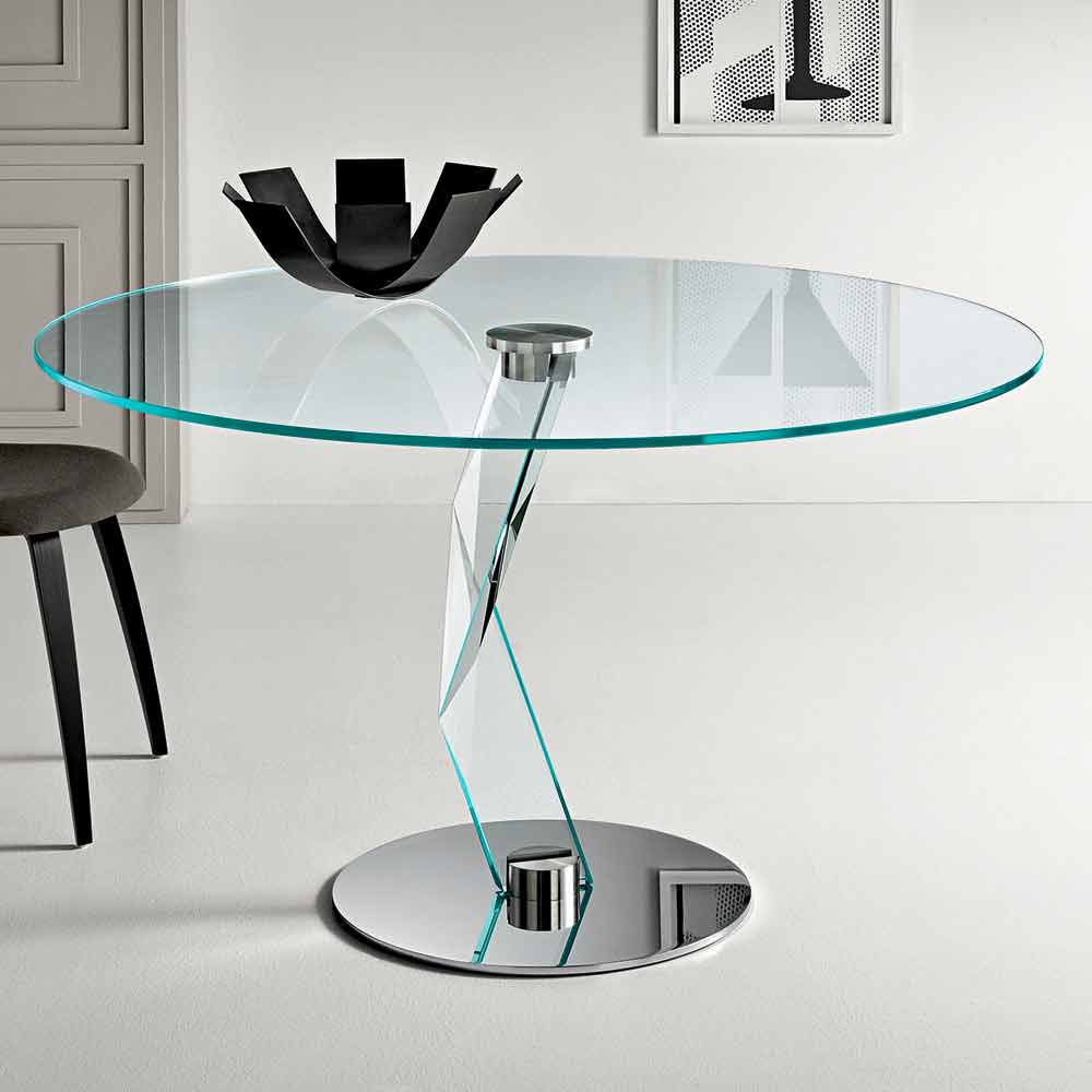 Runder Küchentisch mit extra klarer Glasplatte und extra klarem Glas und verchromtem Metallfuß in modernem Design, hergestellt in Italien.
