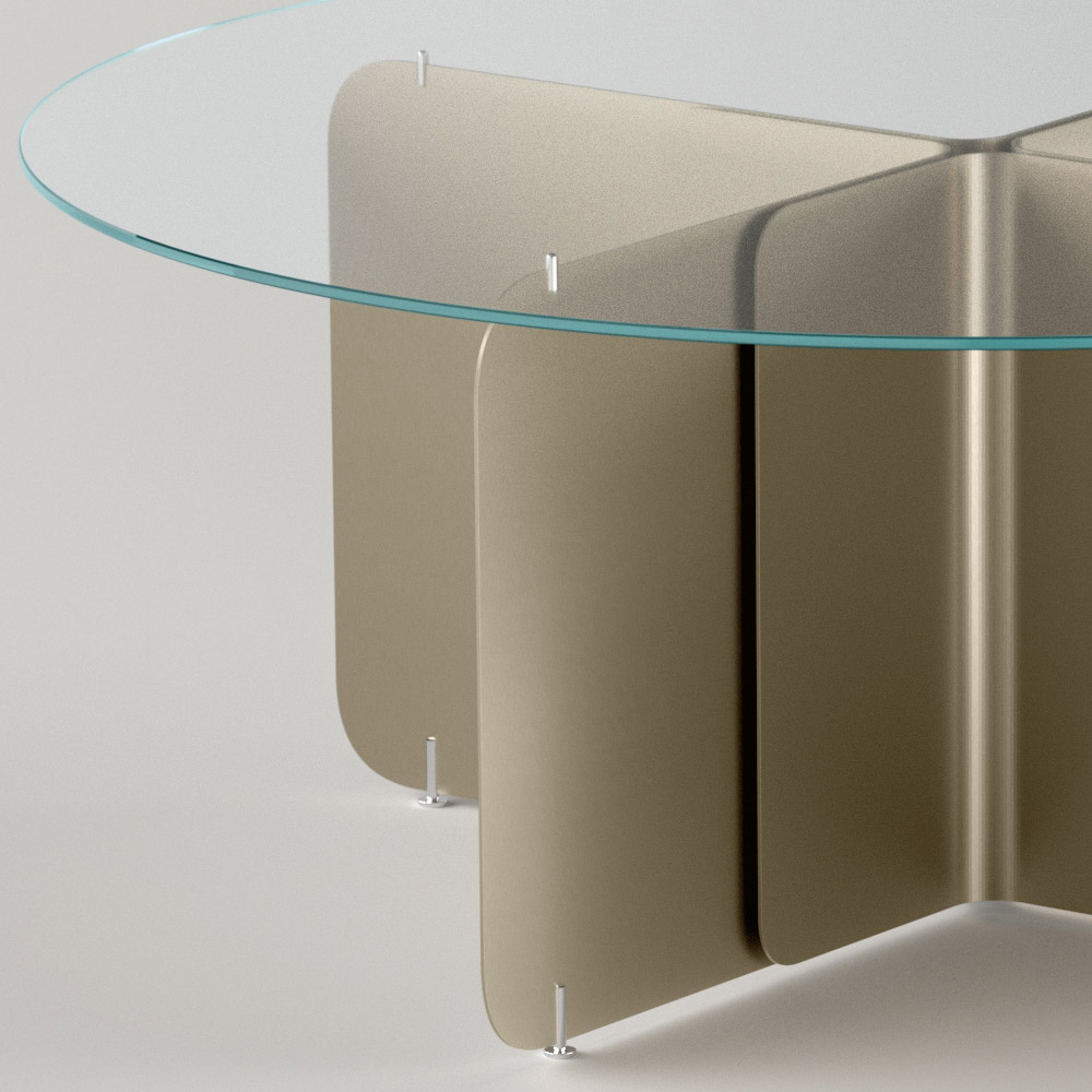 Dieser Tisch ist eine bezaubernde Mischung aus minimalistischer Eleganz und moderner Funktionalität , perfekt für alle, die ein unverwechselbares und dennoch diskretes Möbelstück suchen. Die transparente Glasoberfläche bietet einen vollständigen Blick auf die darunter liegenden Strukturen und bringt die geometrischen Basen in Champagnertönen zur Geltung.