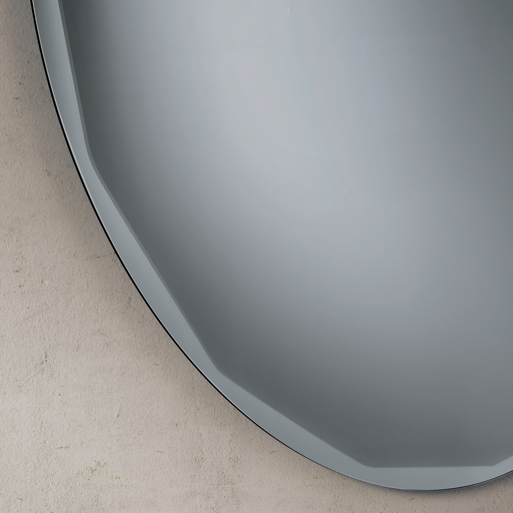 Der Spiegel besticht durch seine klare, runde Form , die durch einen raffinierten seitlichen Facettenschliff veredelt wird. Dieser betont die Konturen und unterstreicht das minimalistische Design. Das Detail erzeugt ein subtiles Lichtspiel am Rand und verleiht der Oberfläche Tiefe und Leuchtkraft.