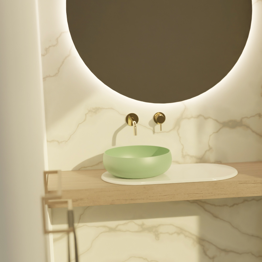 Dieses runde Keramikwaschbecken ist ein Meisterwerk minimalistischen Designs und funktionaler Eleganz. Seine perfekt runde Form, kombiniert mit den zarten Farbtönen, ruft ein Gefühl von Gelassenheit und Reinheit hervor und verwandelt das Badezimmer in einen Zufluchtsort der Ruhe und des Stils.