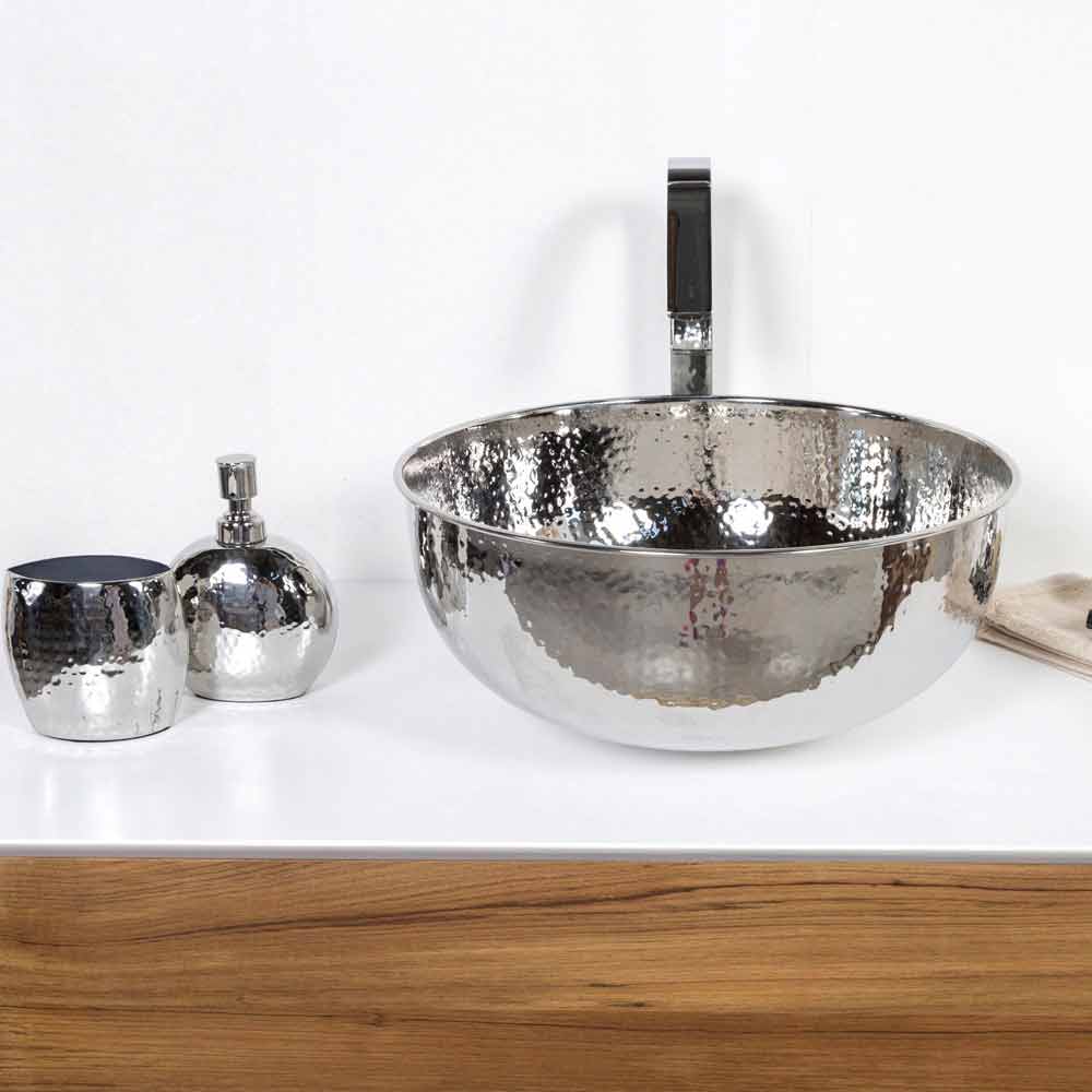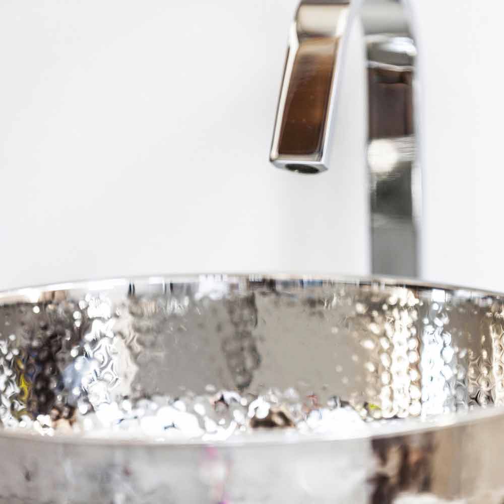 Modernes Waschbecken aus gehämmertem verchromtem Messing . Der gewölbte obere Rand verleiht dem Waschtisch mehr Stabilität und Reinigungsfreundlichkeit.