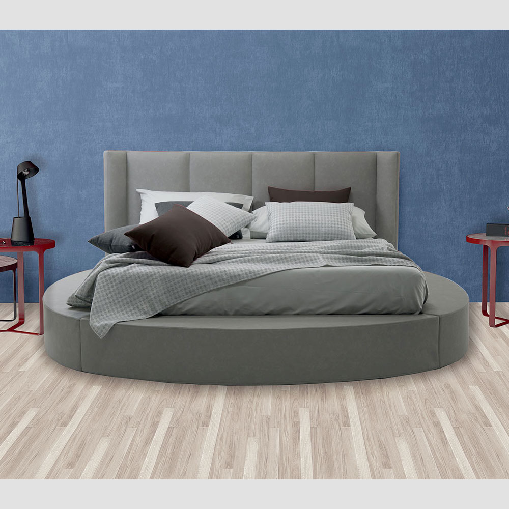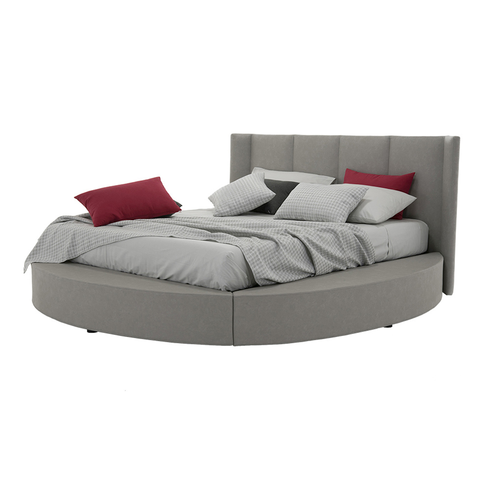 Hochwertiges Doppelbett mit Container und rundem Bettrahmen aus Stoff oder Kunstleder, handgefertigt in Italien.