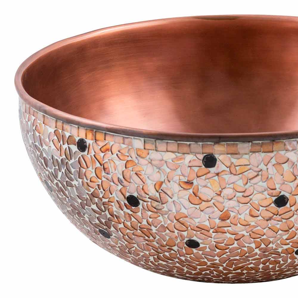 Murello ist ein runder Aufsatzwaschtisch aus Kupfer mit innenliegendem antikem Kupfer und außerhalb der Mosaike.