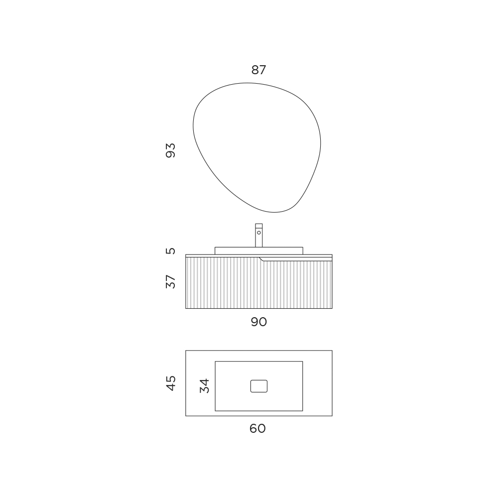 - Waschbecken: Länge 60 x Tiefe 34 x Höhe 15,7 cm