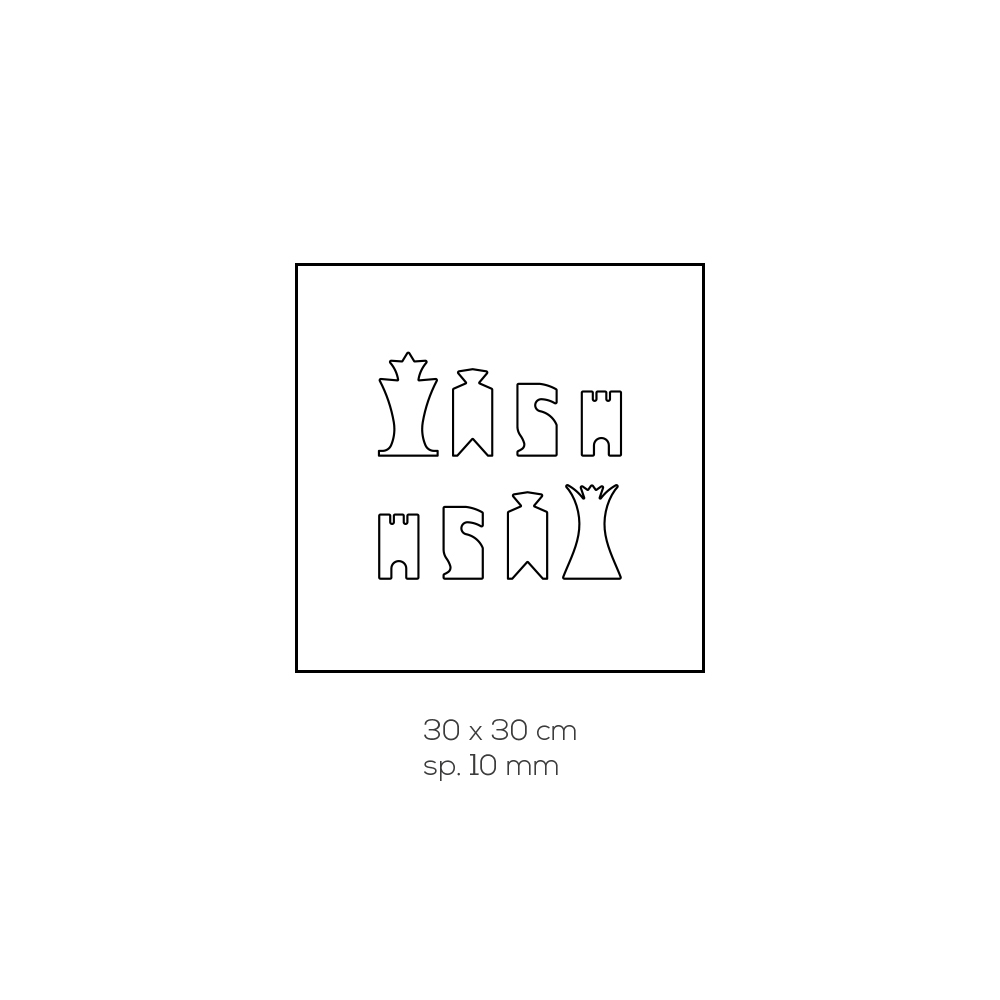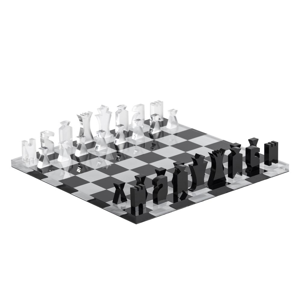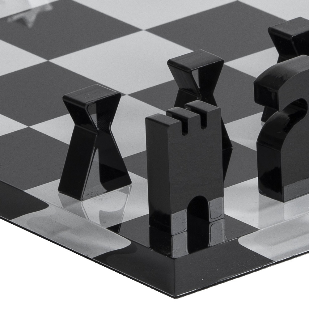 Elegante Schach- und Damebox mit Schachbrett aus transparentem Acrylglas mit Siebdruck und Schwarz.