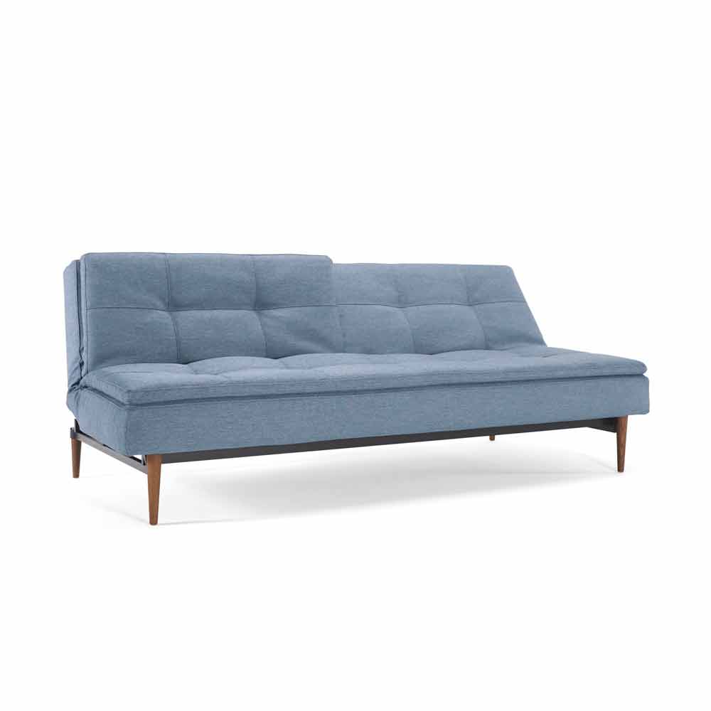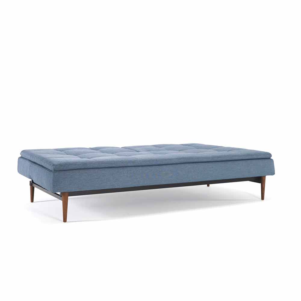 Blaues Schlafsofa mit skandinavischem Design in 3 Positionen verstellbar Dublexo von Innovation, Füße aus dunklem Holz, mattschwarze Struktur.