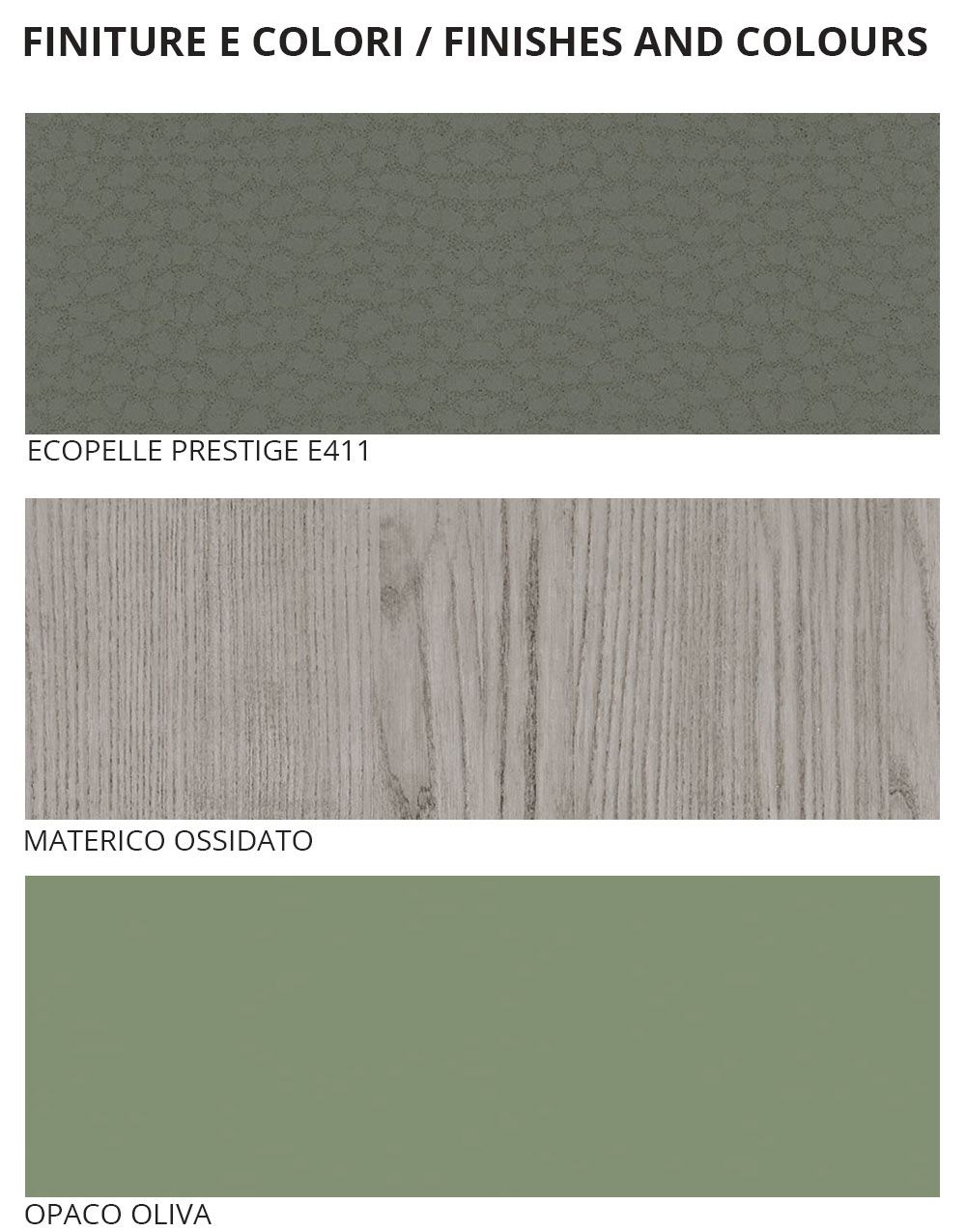 Kopfteil mit Kunstlederbezug , Nachttisch mit einer Schublade und Kommode mit 4 Schubladen (bestehend aus 4 modularen Elementen) aus oxidiertem und matt lackiertem Holz mit Olivfinish ,