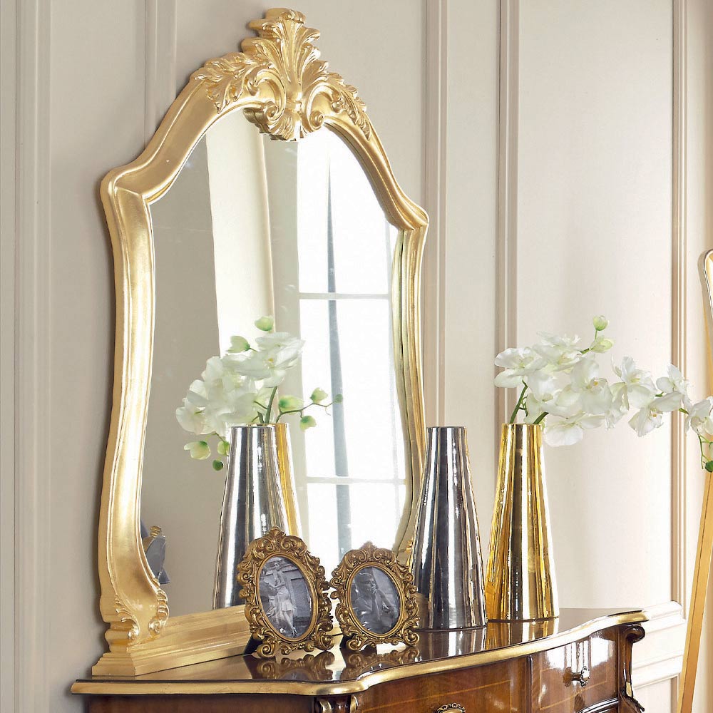 Bassano Nussbaum und Altgold mit eleganten Intarsien und 5 praktischen Schubladen. Die Kommode ist auch komplett mit einem geformten Spiegel aus Holz, der mit Blattgold bedeckt ist.
