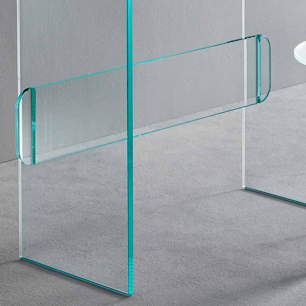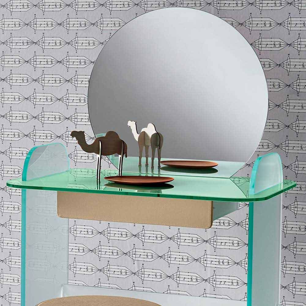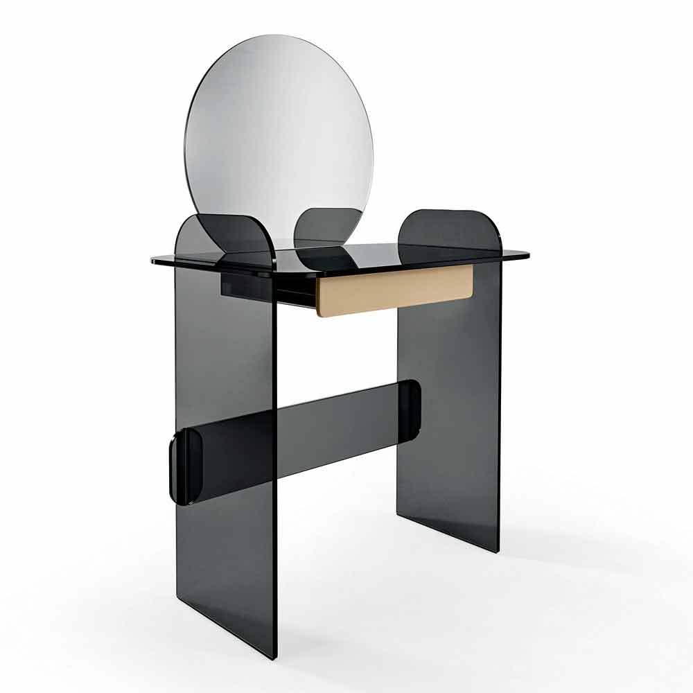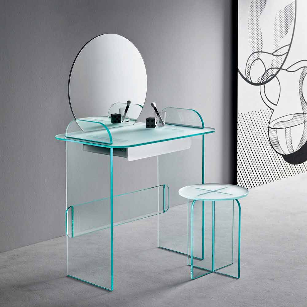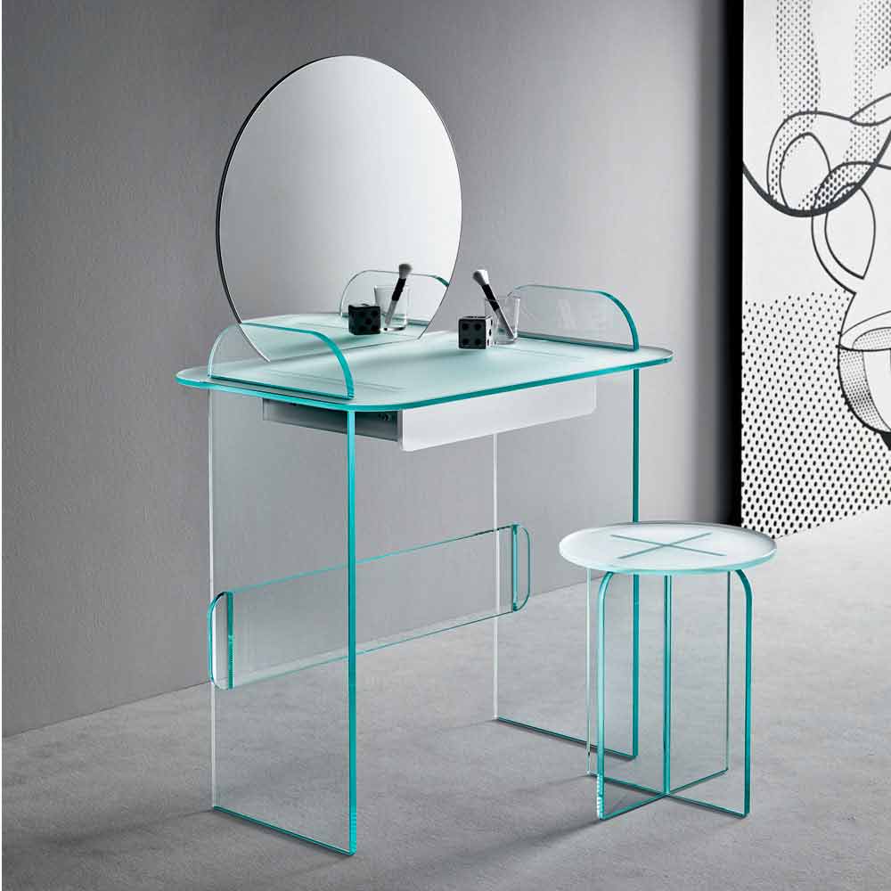 Schminktisch mit Spiegel und Schublade aus extra klarem, geräuchertem oder grünem Glas made in Italy.