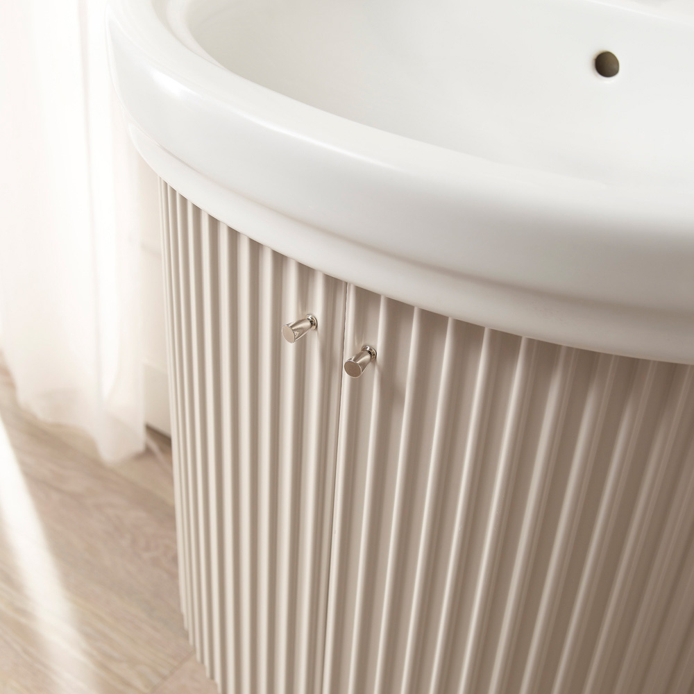 Badezimmerschrank aus MDF mit zwei Türen in Cannetté-Verarbeitung , mattes Finish, ein Regal aus MDF Idro, komplett mit Keramikwaschbecken und Nickelknöpfen , inklusive mattweißer MDF-Beine .
