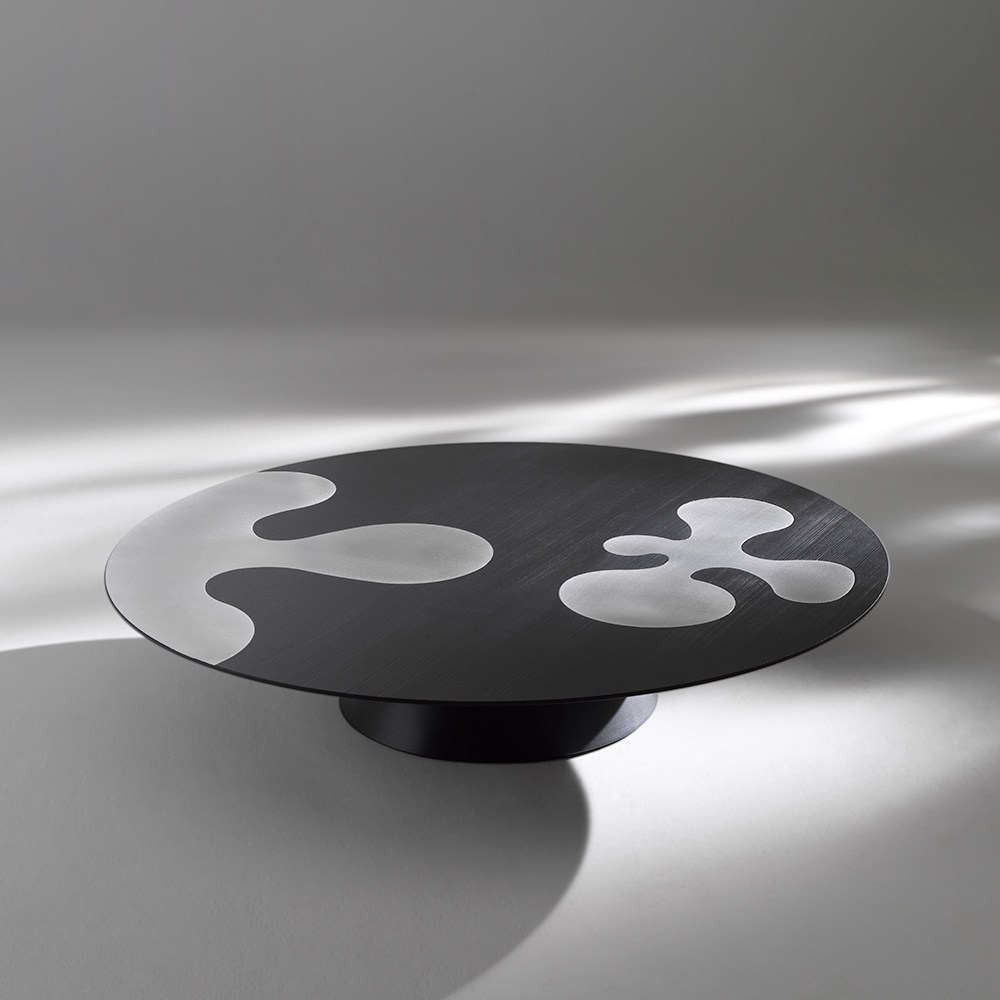 Der aus schwarz lackierter Lärche gefertigte Couchtisch bringt die satte Farbe und die charakteristische Maserung des Holzes optimal zur Geltung, während Metallelemente zarte Lichtreflexe erzeugen, die das Gesamtbild bereichern. Der zentrale Fuß sorgt für Stabilität und unterstreicht den skulpturalen Charakter.