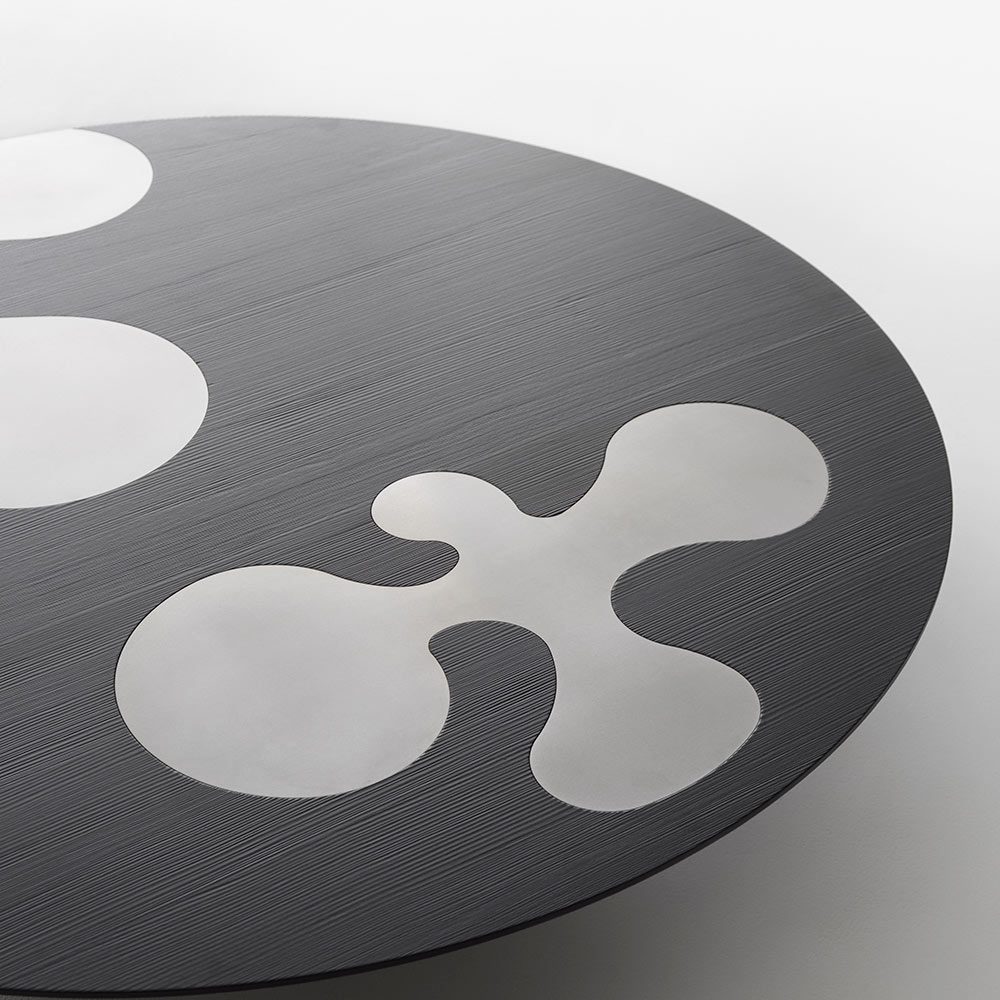 Dieser runde Design-Couchtisch besticht durch seine grafische, moderne Ästhetik, bei der klare Formen auf ein raffiniertes Zusammenspiel kontrastierender Materialien treffen. Die runde Tischplatte wird zu einer ausdrucksstarken Oberfläche mit Einsätzen aus satiniertem Edelstahl , die sich wie abstrakte, dynamische Motive vom dunklen Hintergrund abheben.