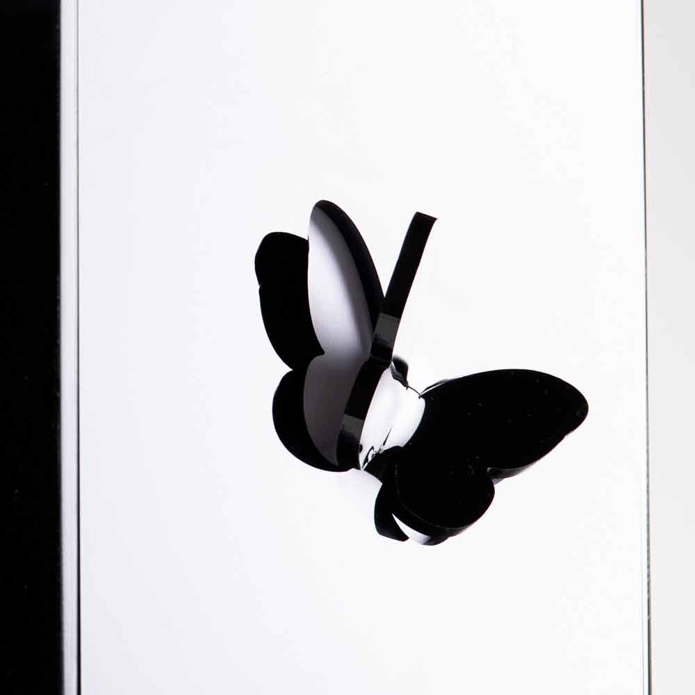 Der Schirmständer aus schwarzem Plexiglas zeichnet sich durch die Darstellung von laserbeschrifteten Winterzweigen und dreidimensional dekorierten Schmetterlingen und Edelstahlsockeln aus.